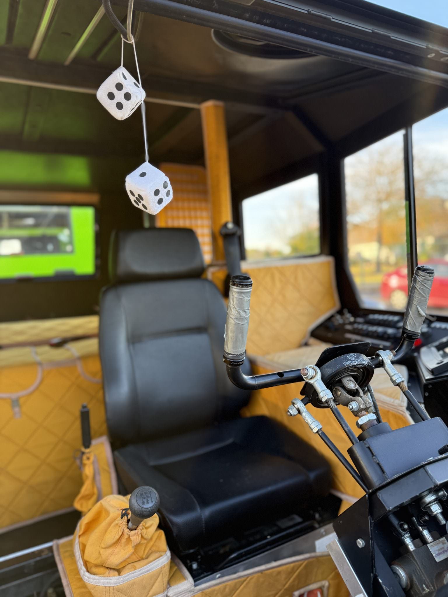 Due to the layout of the cab a reverse-view camera is fitted to allow safe reversing when needed, there’s also a towing hitch on the back, and a full roll cage is fitted just in case you happen to flip it over.