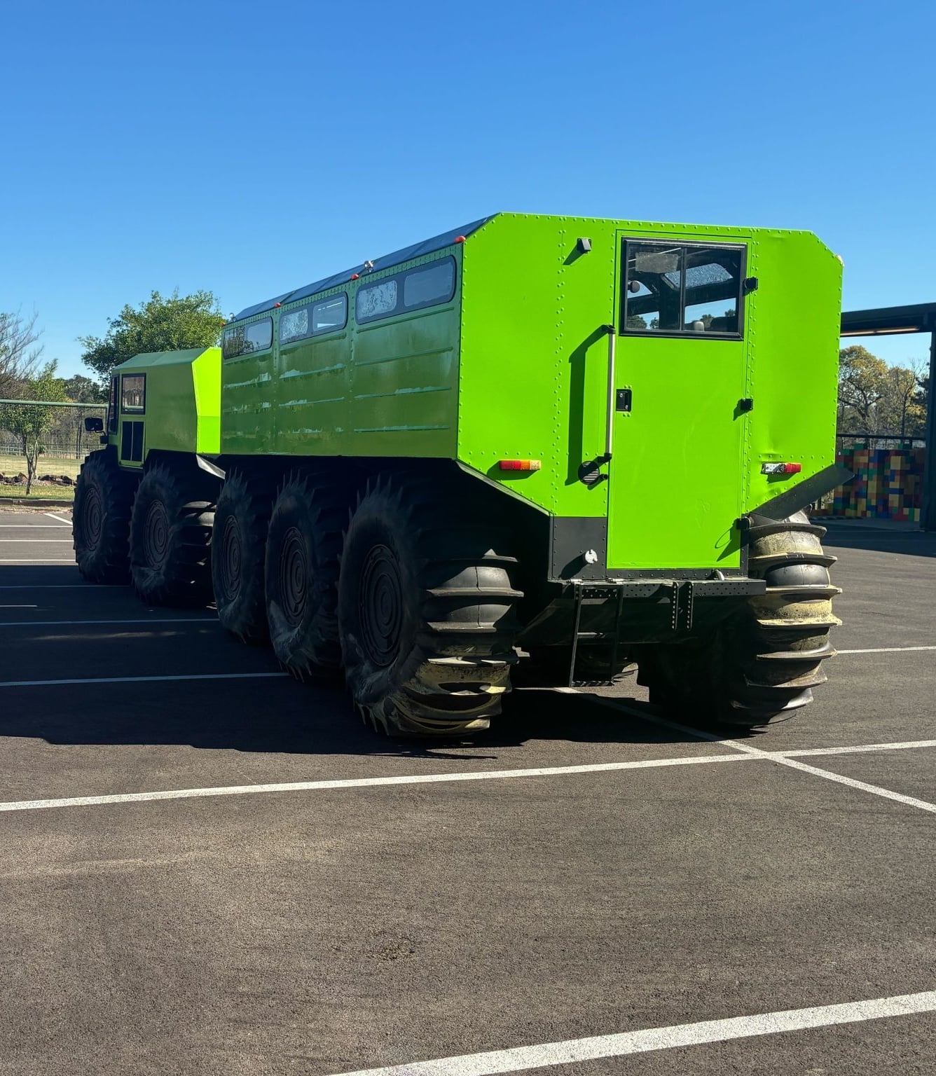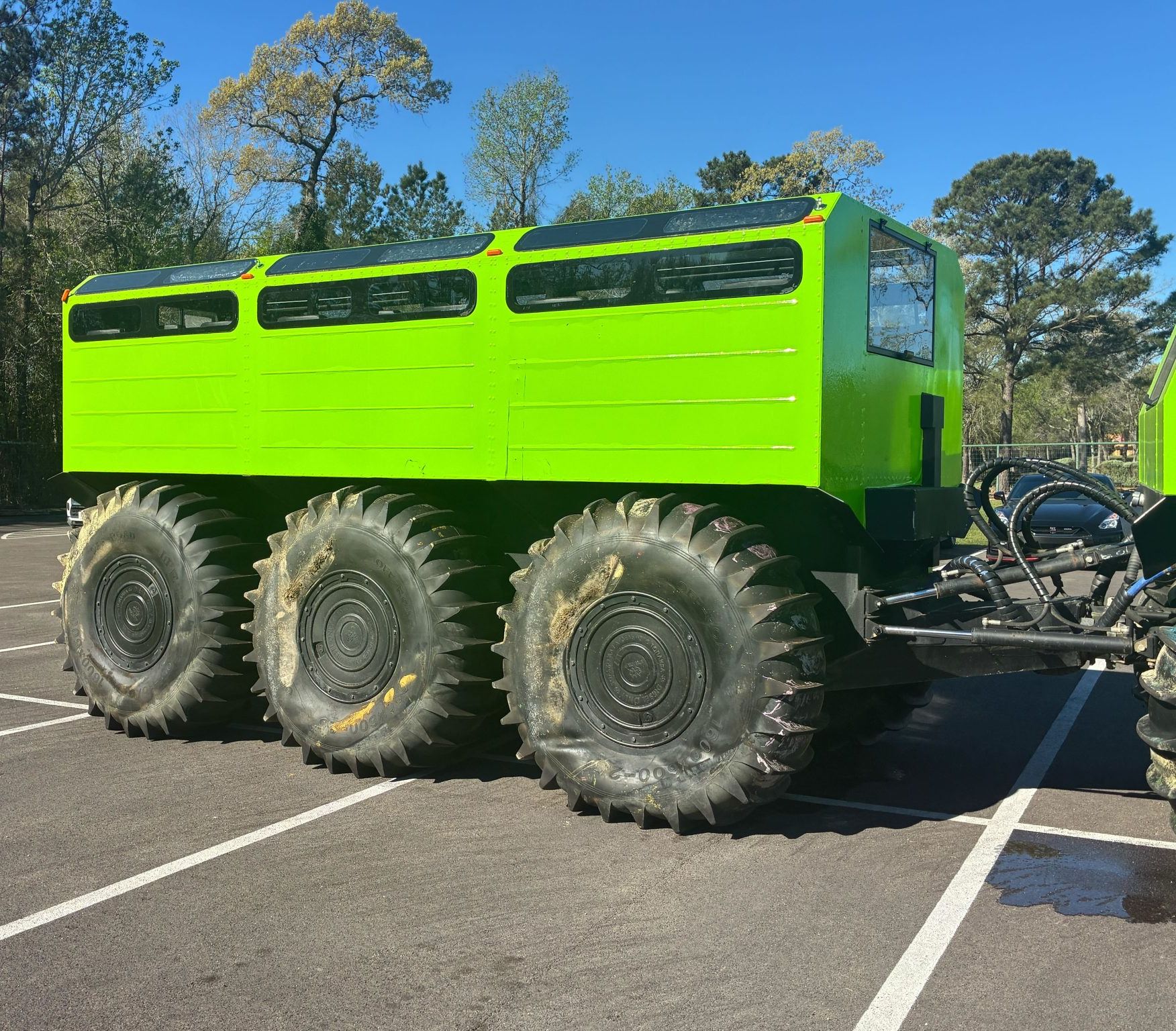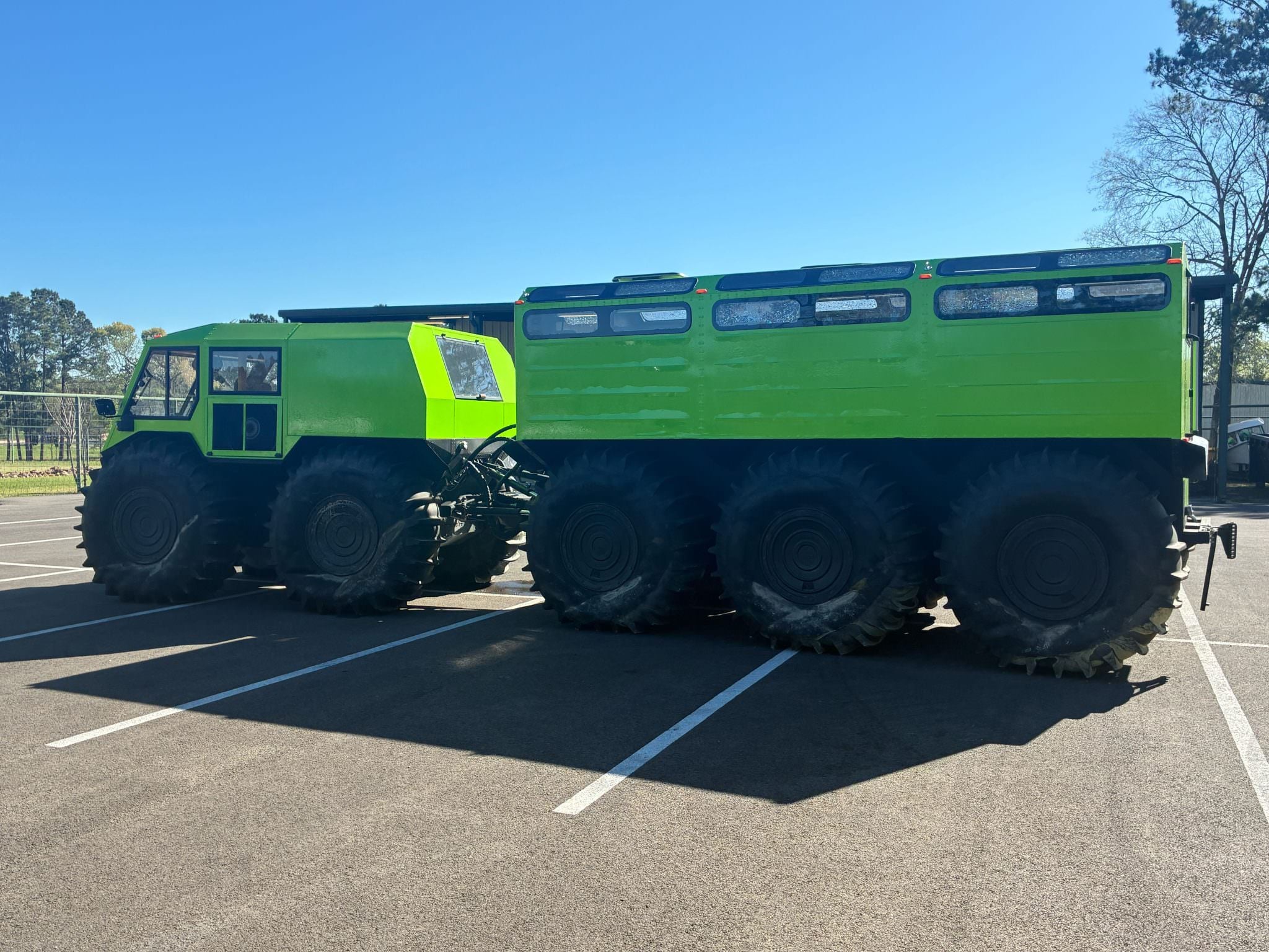 This is a Quadro Sherp with an attached Ark module, when combined like this it forms a 10-wheel drive amphibious off-roader capable of carrying up to 19 people across almost any terrain you point it at.