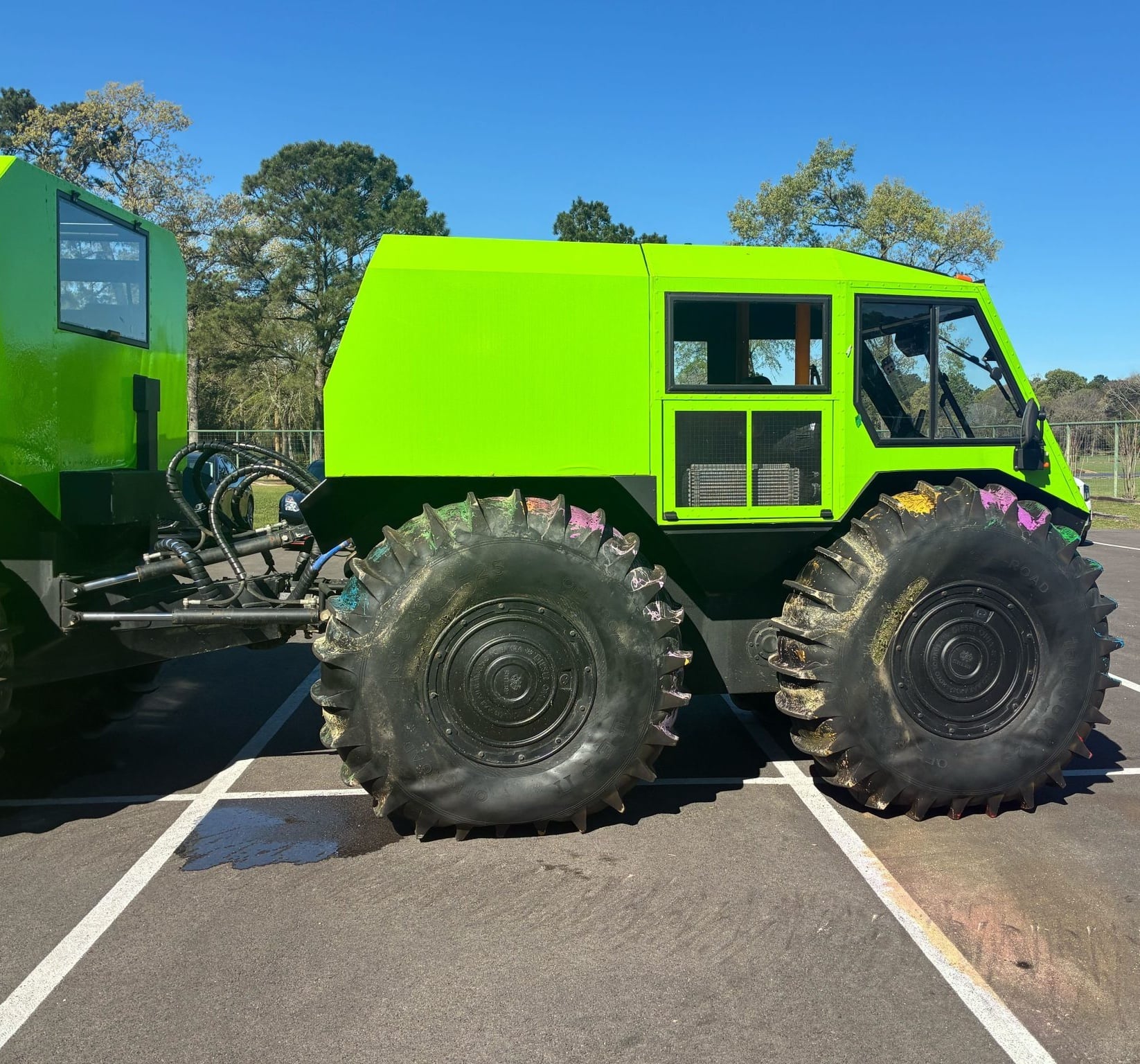 The vehicle is fitted with 25″ bead-lock wheels and 63″ low-pressure tires with a paddle-like tread for traversing water and soft terrain. These tires are all linked to a central inflation system that can increase or decrease tire pressure on the go.