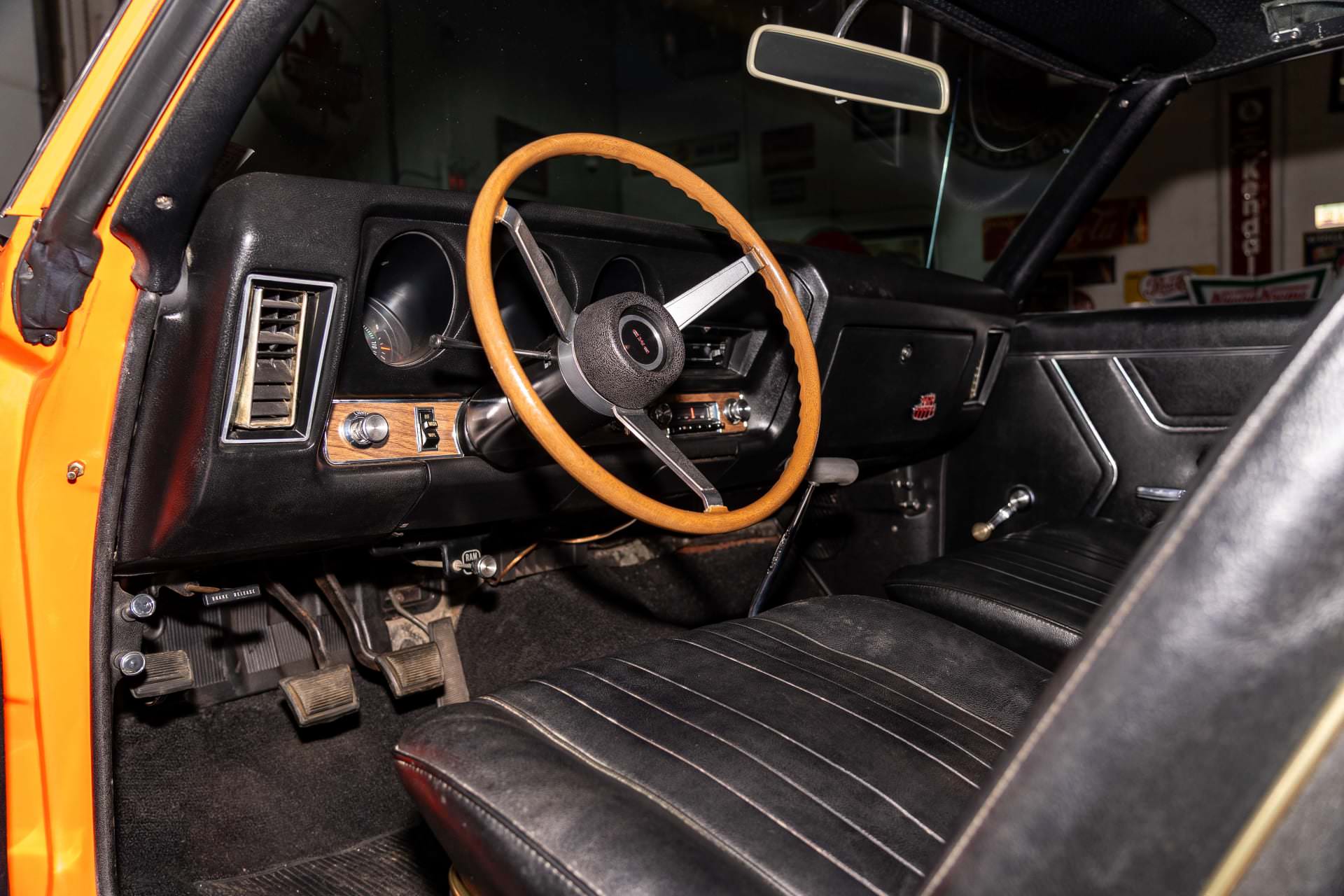 Inside, you’ll find bucket seats, a Hurst T-handle shifter, a push-button radio, faux wood trim, “The Judge” badging, and that famous pull-knob under the dash for opening the Ram Air scoop when you need more cool air for the intake.