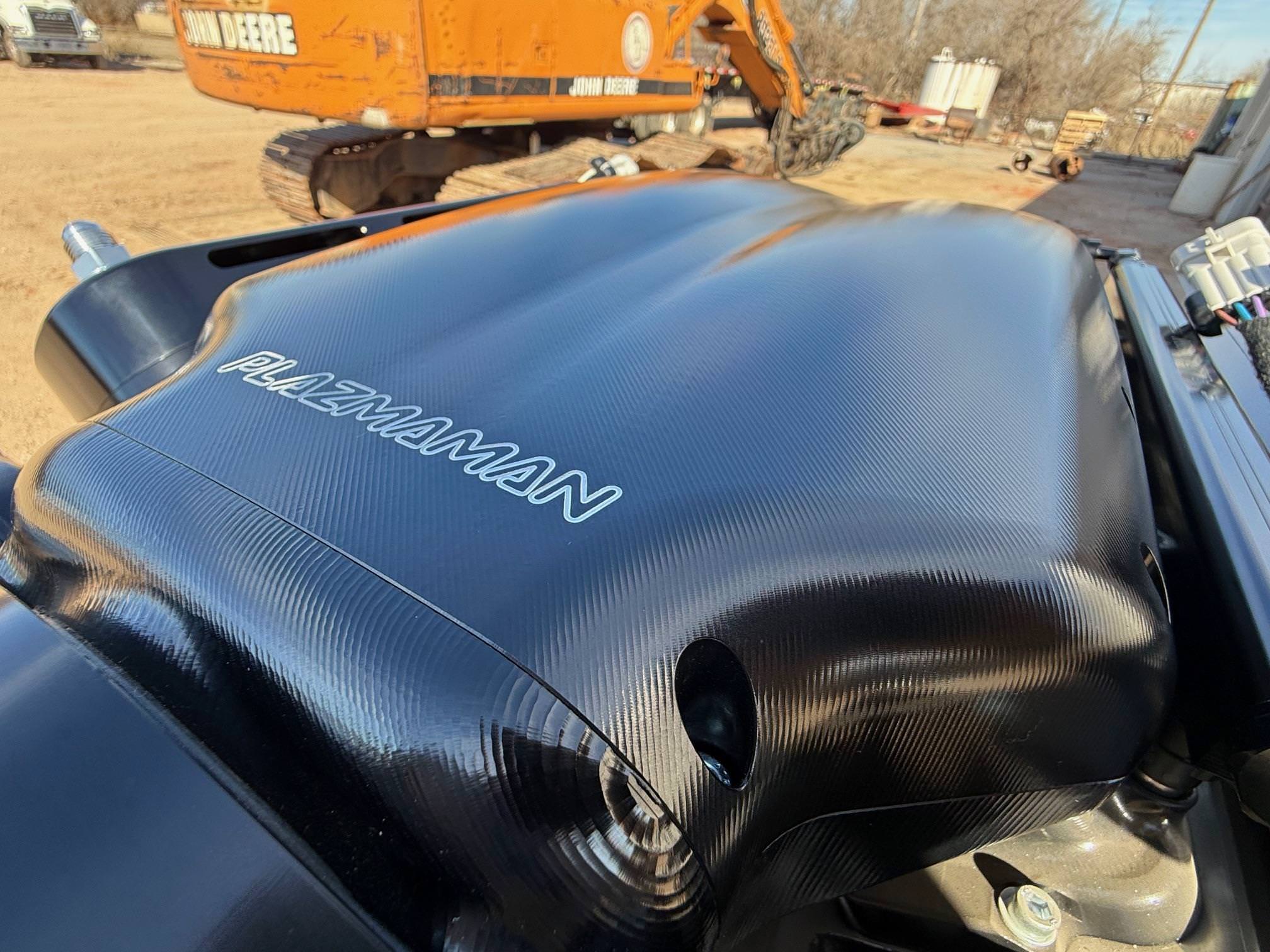 This engine is fitted with a Plasmaman billet anodized intake manifold and fuel rails, an ATI Super Damper harmonic balancer, a Moroso seven-quart high-clearance oil pan, Tru-Ram polished stainless steel headers, and an ICT eight-bolt flywheel.