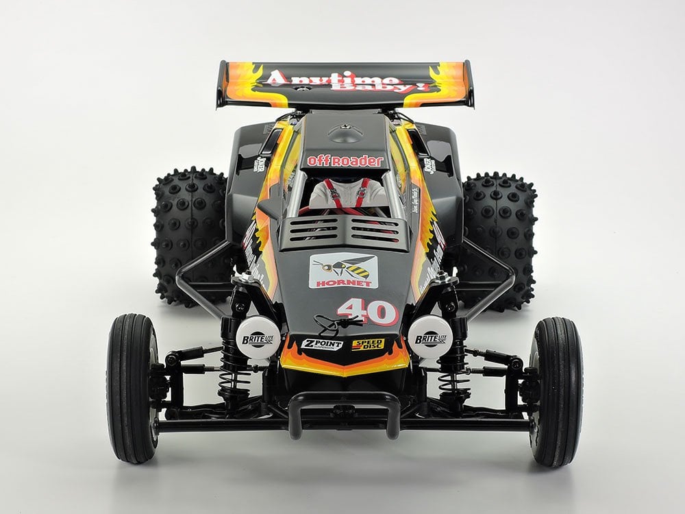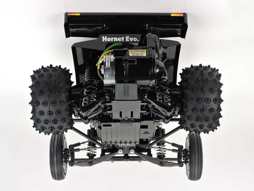 20 years later in 2024 Tamiya celebrated the Hornet’s 40th anniversary with the Hornet EVO – this was a modernized version of the classic design with independent double-wishbone suspension, CVA oil dampers, a DT-02-derived sealed gearbox with bevel differential, and full ball bearings – marking four decades of one of the most beloved RC buggies ever built in style.