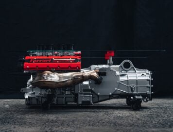 This is a Ferrari F355 V8 engine that has been transformed into a glass-topped coffee table and installed on discreet wheels to make it…