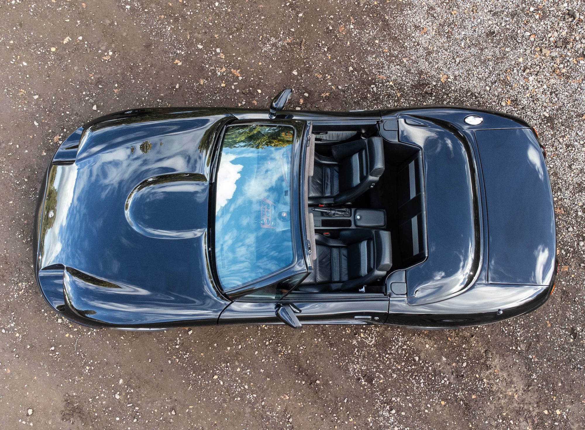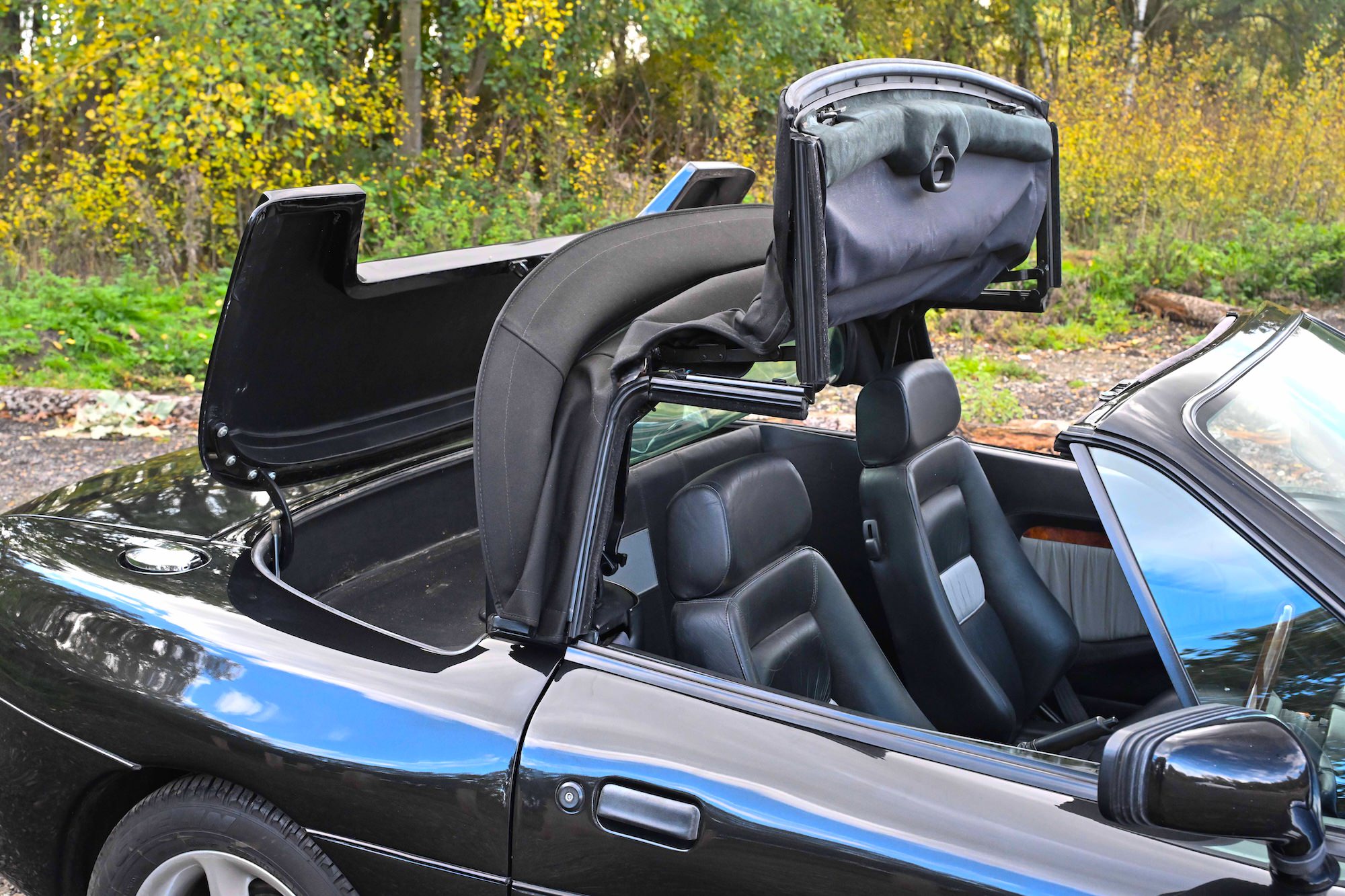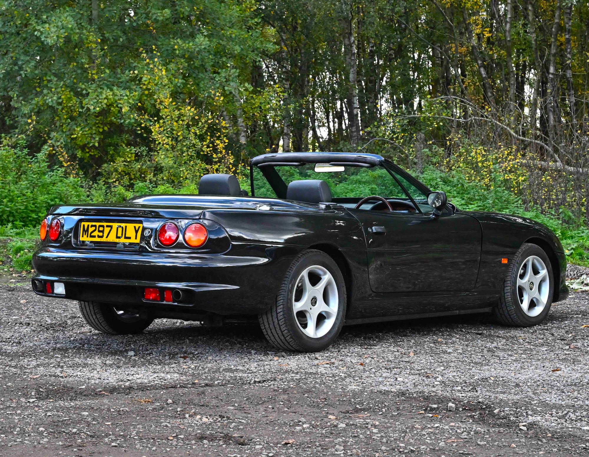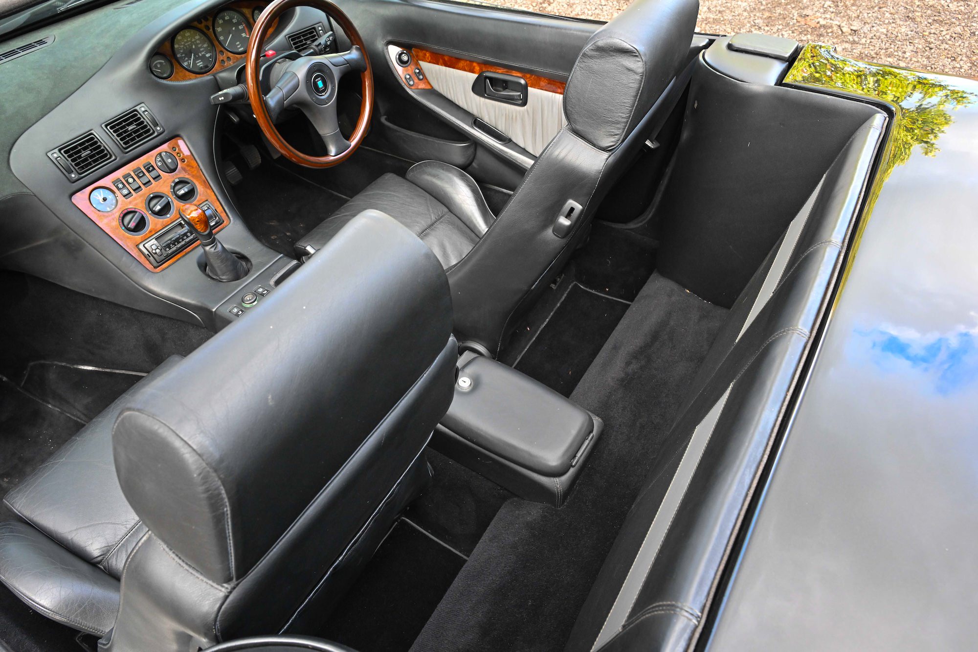 It’s finished in black paintwork over a matching black interior with wood trim, and it has a black convertible roof.