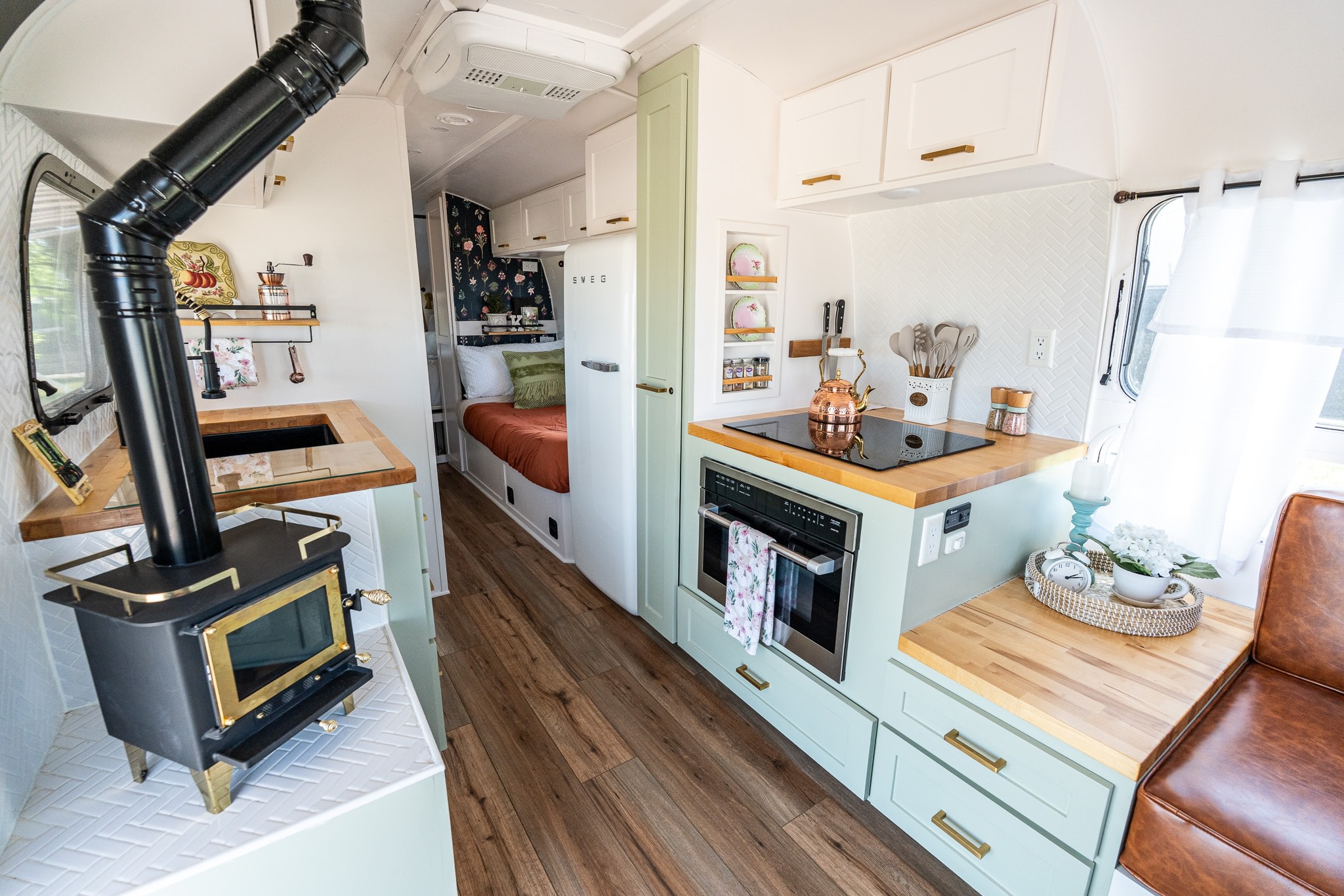 The galley (kitchen) was updated with butcher block counters, a Smeg refrigerator, an induction cooktop, and a convection microwave oven, with cabinetry finished in sage green and white. A small wood-burning fireplace provides a characterful centerpiece, and it vents up through the roof.