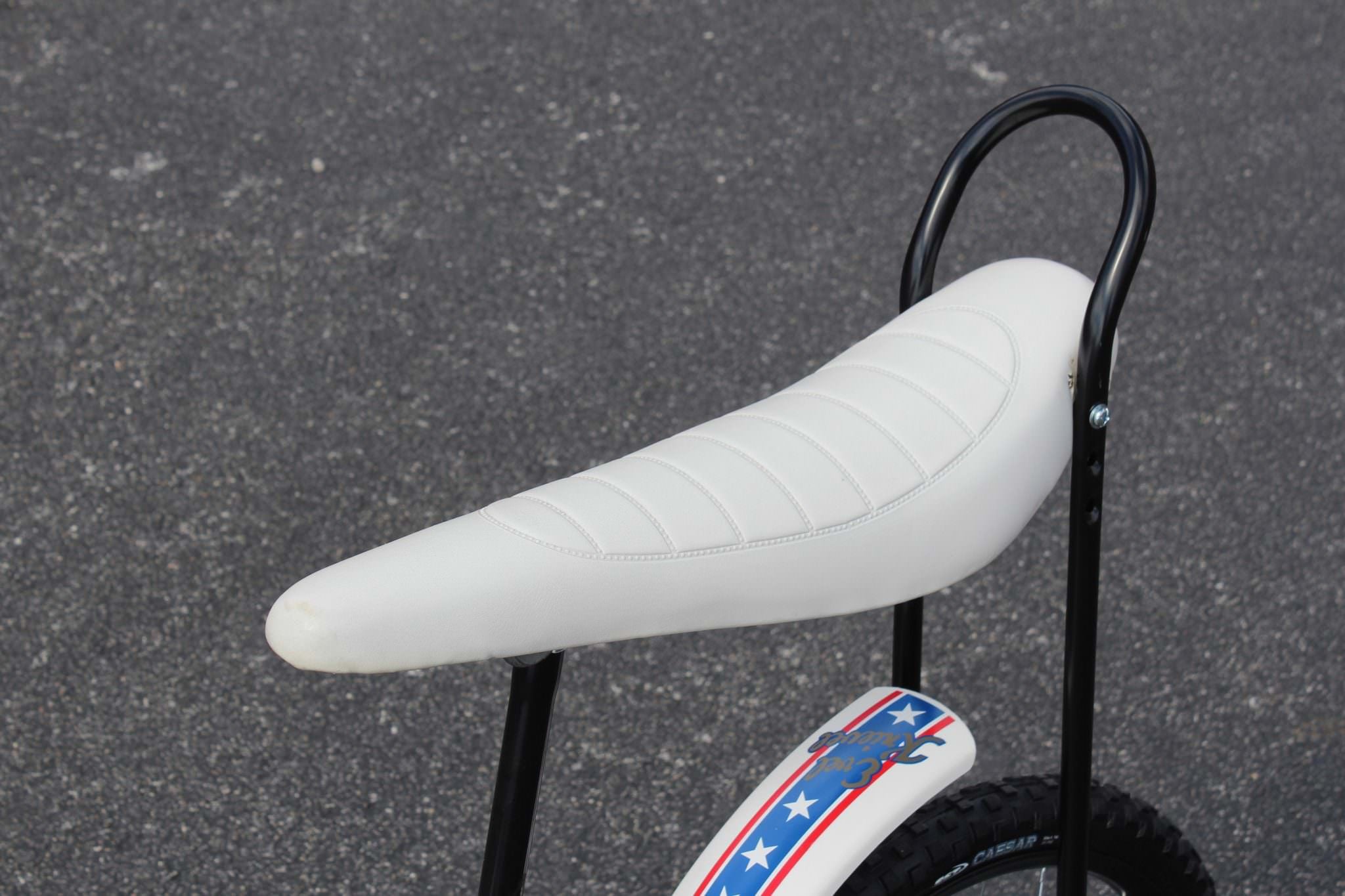 This AMF Roadmaster Evel Knievel bicycle was restored under previous ownership, wearing a white base with red, white, and blue graphics and gold Evel Knievel script. It has a white “banana seat,” a color-matched frame pad, striped plastic fenders, and front and side number plates.