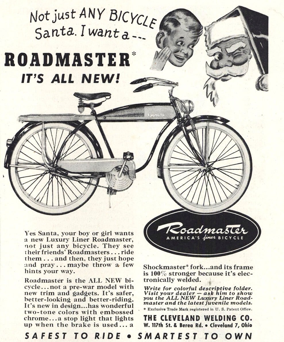 The Roadmaster company can trace its origins all the way back to the Cleveland Welding Company (CWC), a metal fabrication specialist founded in Cleveland, Ohio in 1910 – 116 years ago. CWC initially specialized in electric welding, rolling, and metal forming techniques, and didn’t enter the bicycle business until September of 1935, when it began producing balloon-tire bicycles as a way to keep its factory busy during the tail end of The Great Depression.