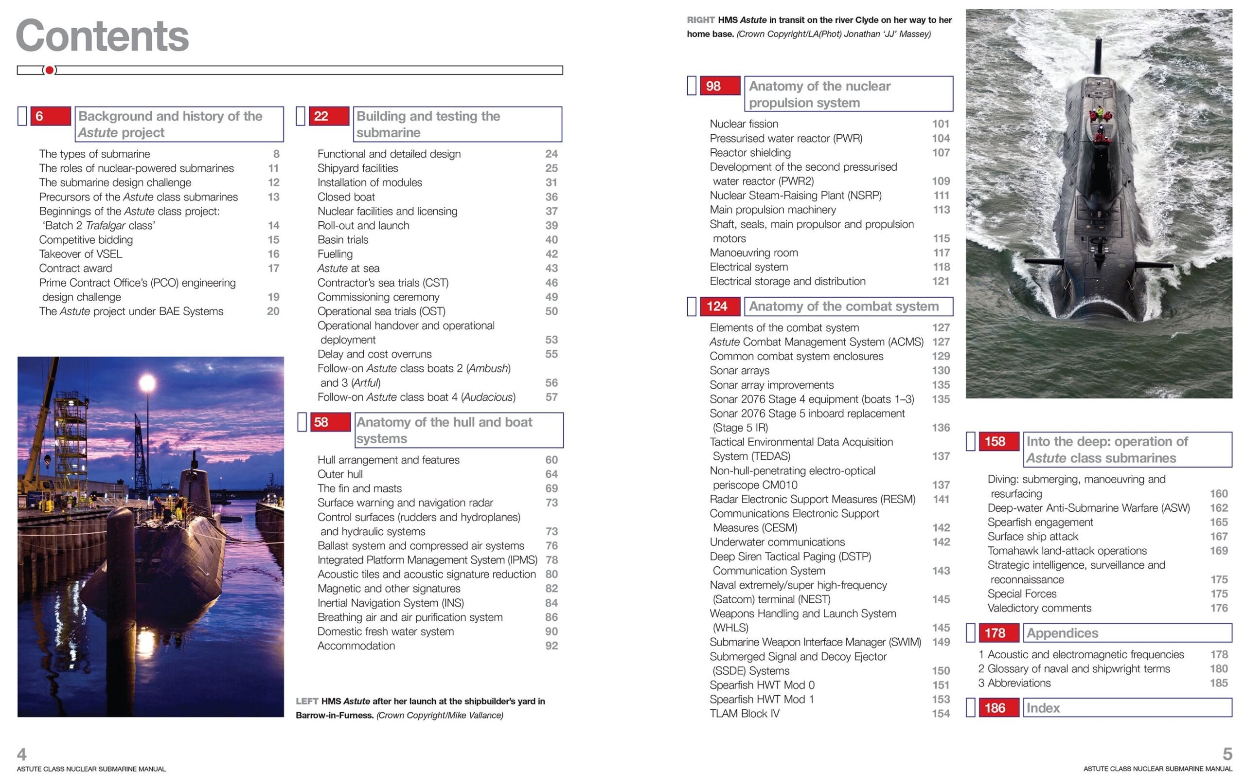 The book functions as a technical and historical study of the class – it follows the development path from the Trafalgar-class to the Astute program, outlining the evolution of Britain’s SSN fleet and the major technological advances involved in stealth, sonar, propulsion, and reactor design.