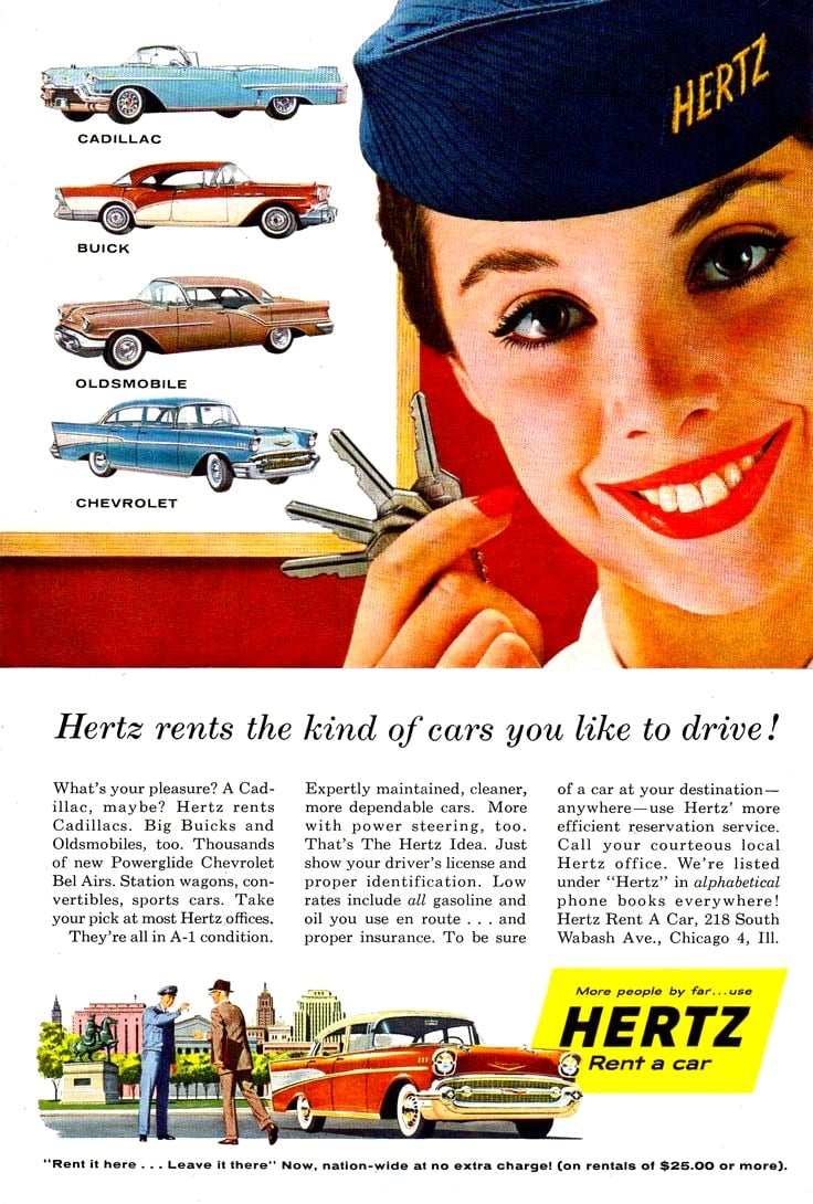 Rental car company Hertz offered a number of higher end options in 1957, including the new 1957 Chevrolet four-door sedan. Image courtesy of Hertz.