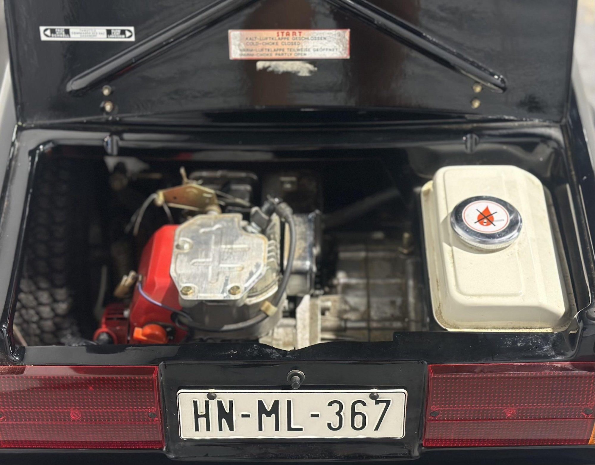 Power is provided by a rear-mounted Honda G100 single-cylinder engine which powers the rear wheels, and the car has front and rear lights, a hinged trunk, a right-hand shifter, and a windscreen.