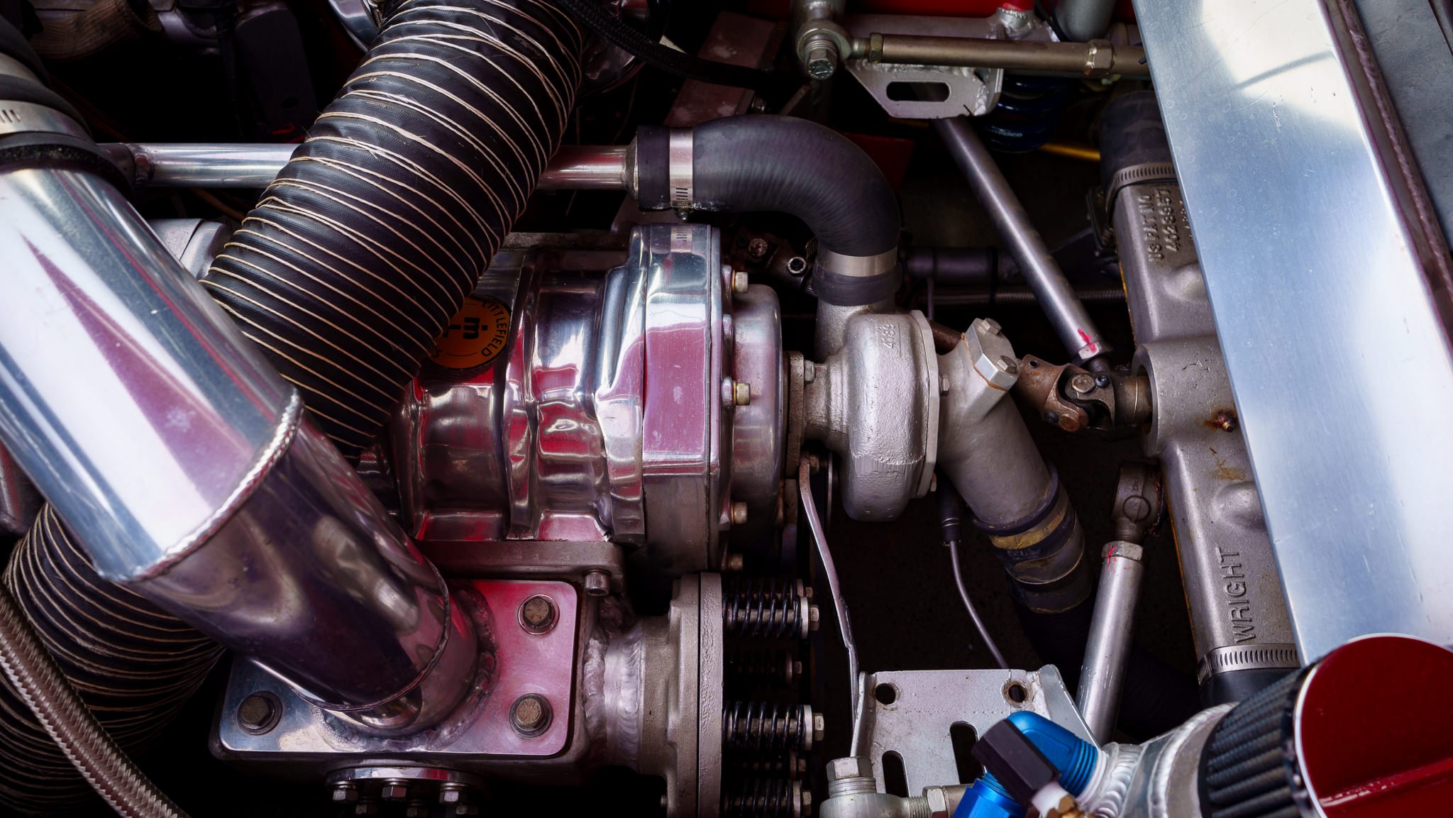 Power is provided by a 355 cubic inch Chevrolet V8 topped with a Potvin-mounted GMC 4-71 supercharger and Rochester fuel injection. The fuel-injection system was rebuilt in 2023, and the battery and various seals were renewed in 2024. A Muncie M22 4-speed manual box sends power to the rear axle, with suspension built around modified VW components and Koni coilovers.