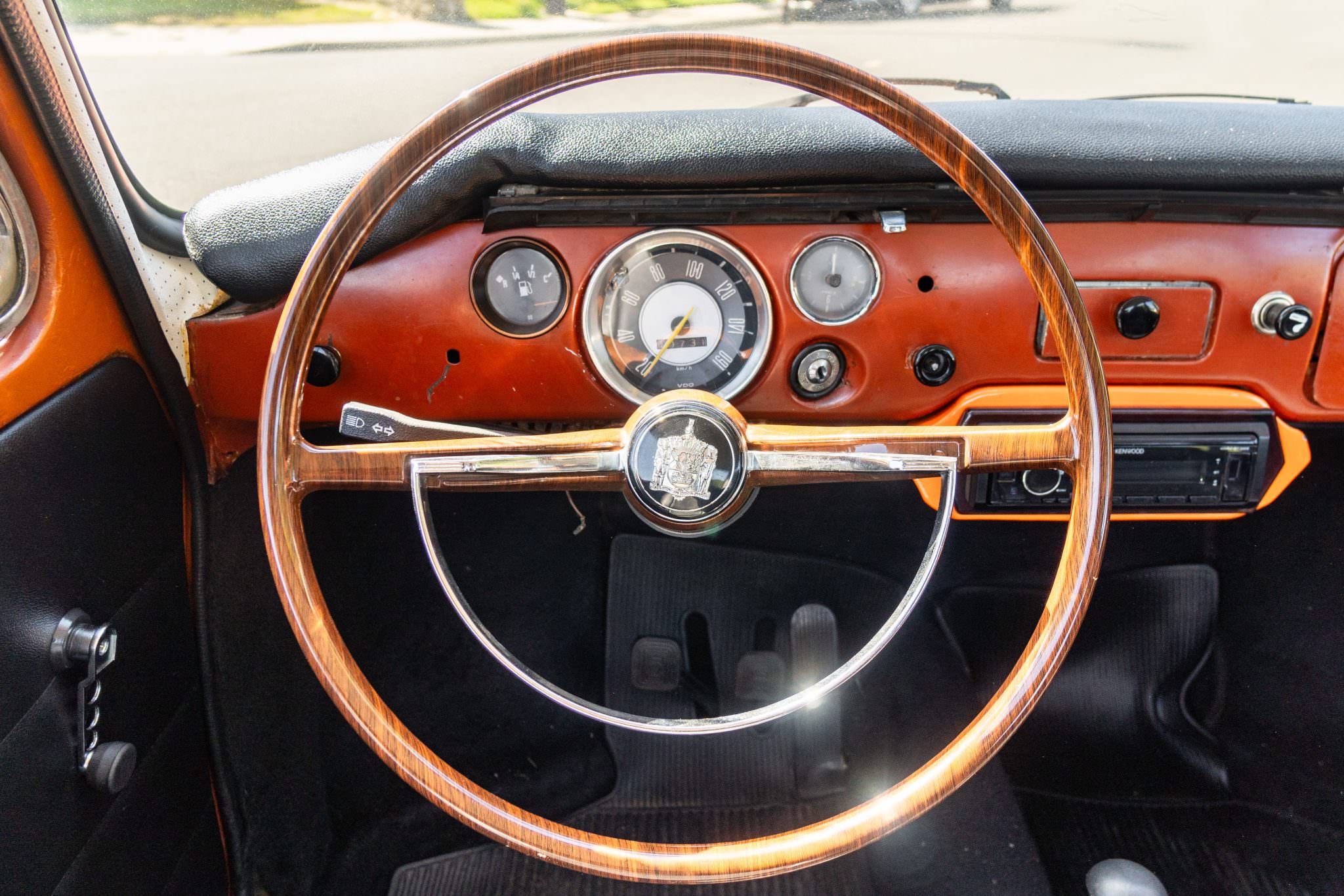 The exterior was refinished in orange before the seller’s ownership and it has quad headlights, chrome bumpers, bright trim, quarter vent windows, and louvered rear quarter panels. It rides on 15″ EMPI alloy wheels with mismatched tires, and the suspension has been lowered slightly – braking is handled by front discs and rear drums.