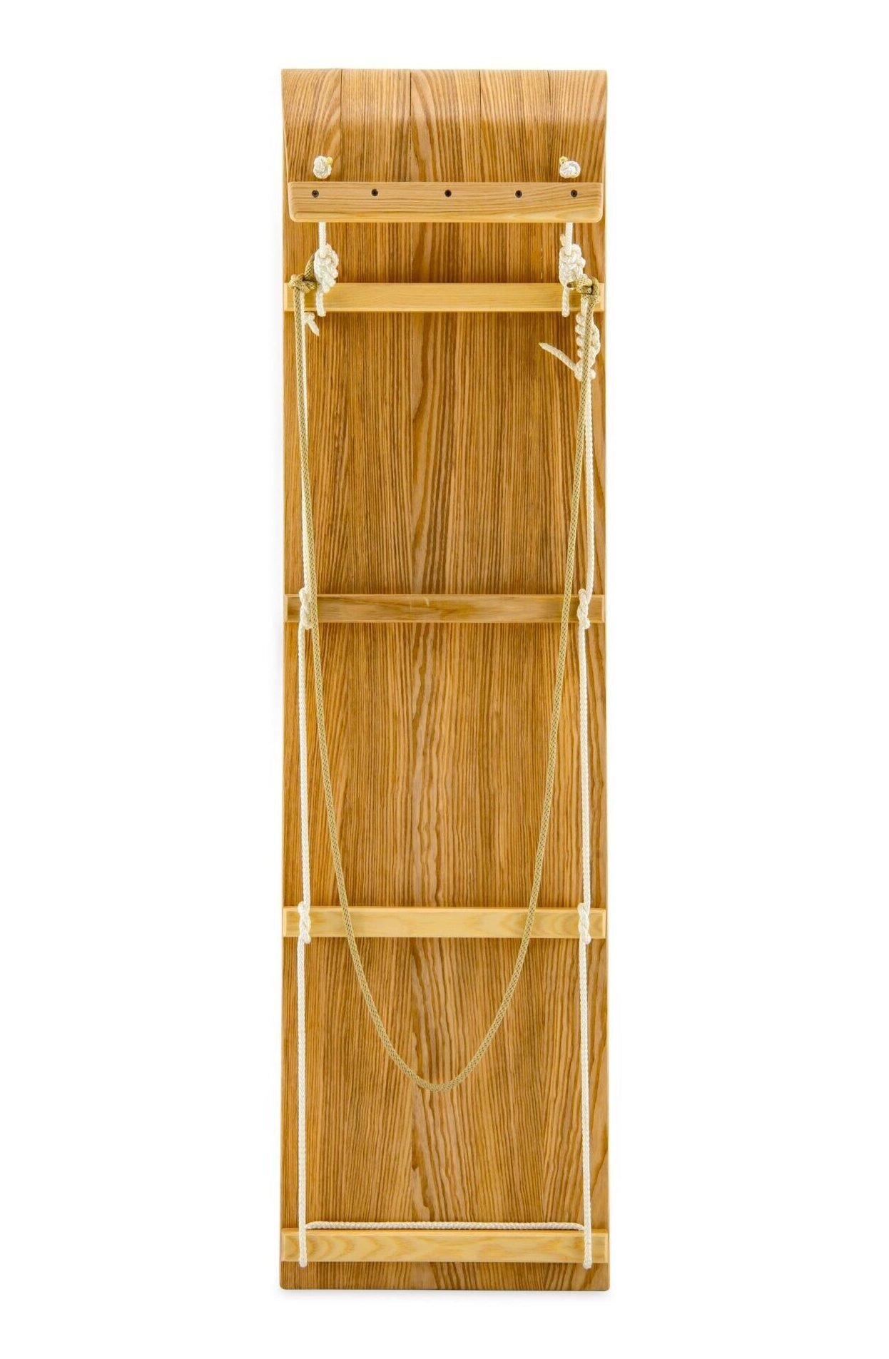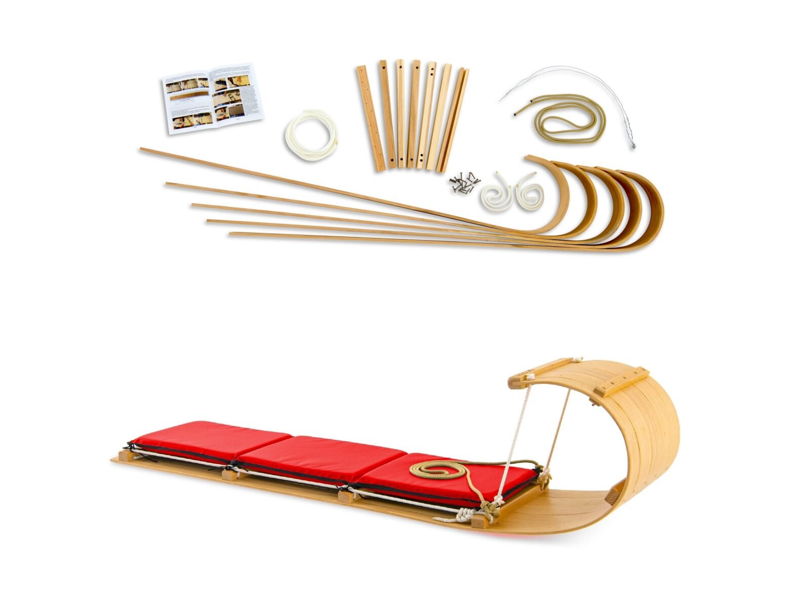 This is the Build-Your-Own Toboggan Kit from the team at The Northern Toboggan Co. Each kit has everything you need to build your own traditional wooden toboggan, including the pre-curved planks, the cross bracing, fixings, rope handles, and an optional green or red seat cushion.