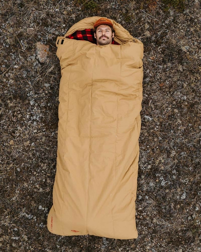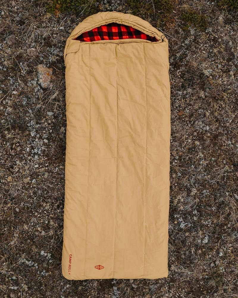 This is the Camp Roll Sleeping Bag from Montana-based company Smith + Rogue. It’s built around a 100% cotton canvas outer shell with a DWR (durable water repellency) coating.