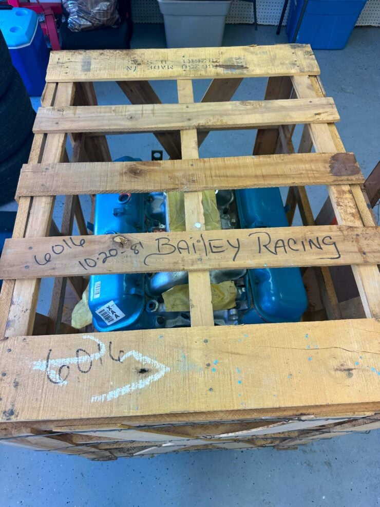 It has remained in its crate since then, though the listing explains that it was occasionally turned by hand while in storage to avoid it seizing due to decades of no use. The block, cylinder heads, and valve covers are painted blue and the engine block casting number is 14015445.