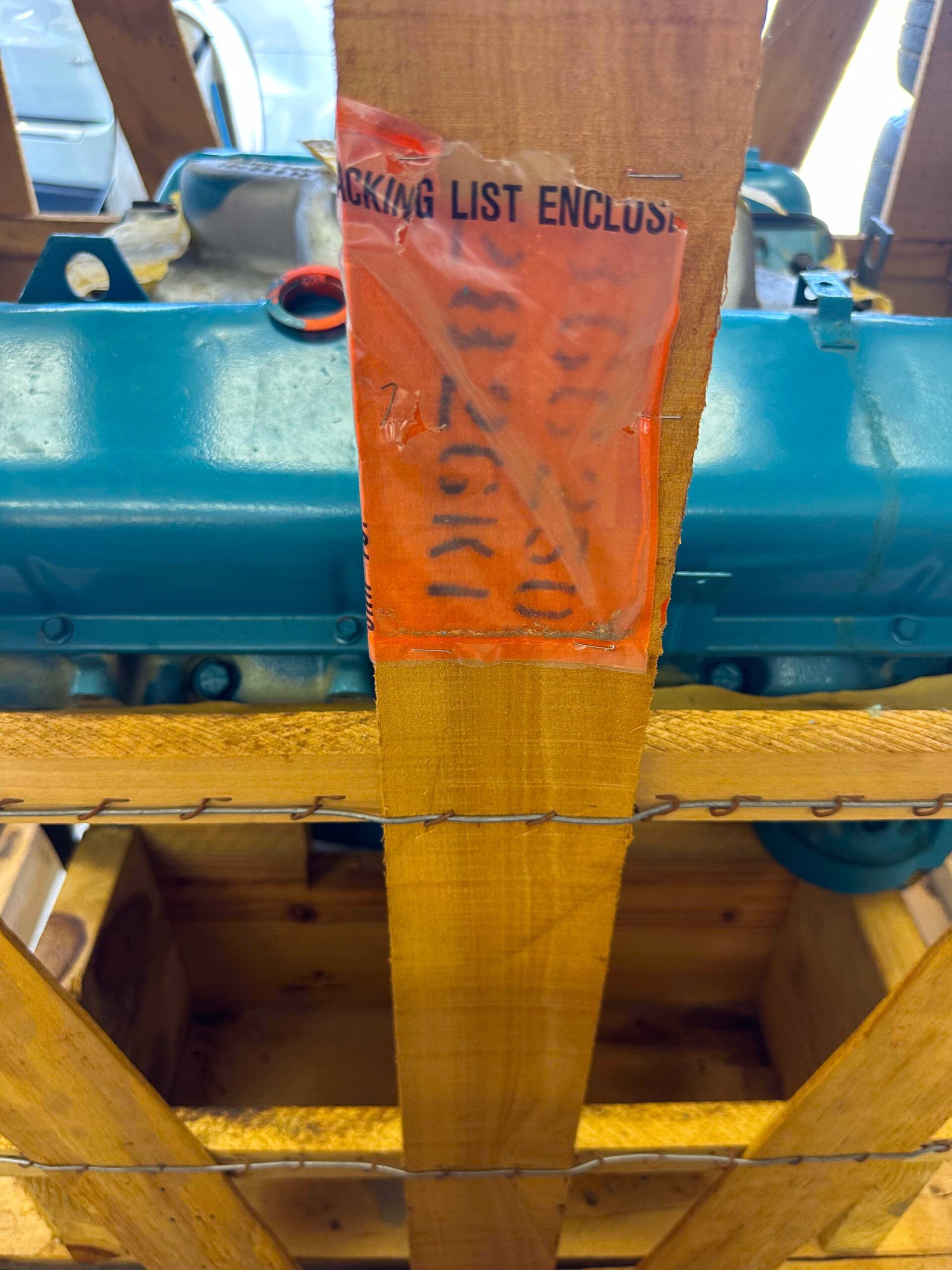 It has remained in its crate since then, though the listing explains that it was occasionally turned by hand while in storage to avoid it seizing due to decades of no use. The block, cylinder heads, and valve covers are painted blue and the engine block casting number is 14015445.