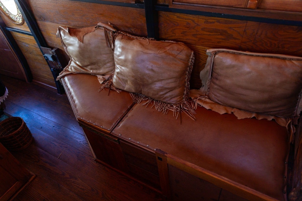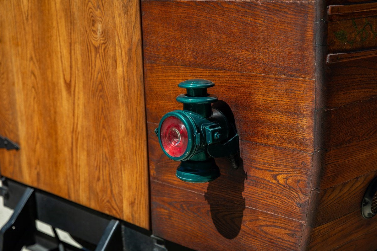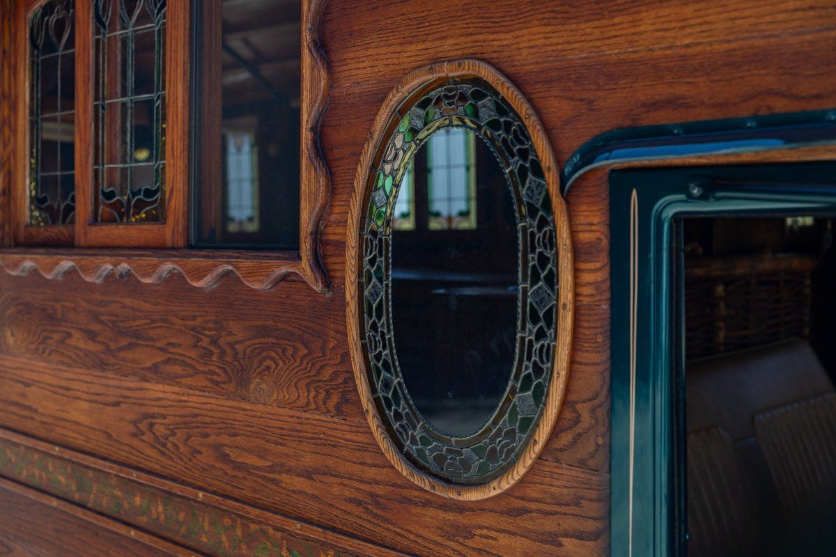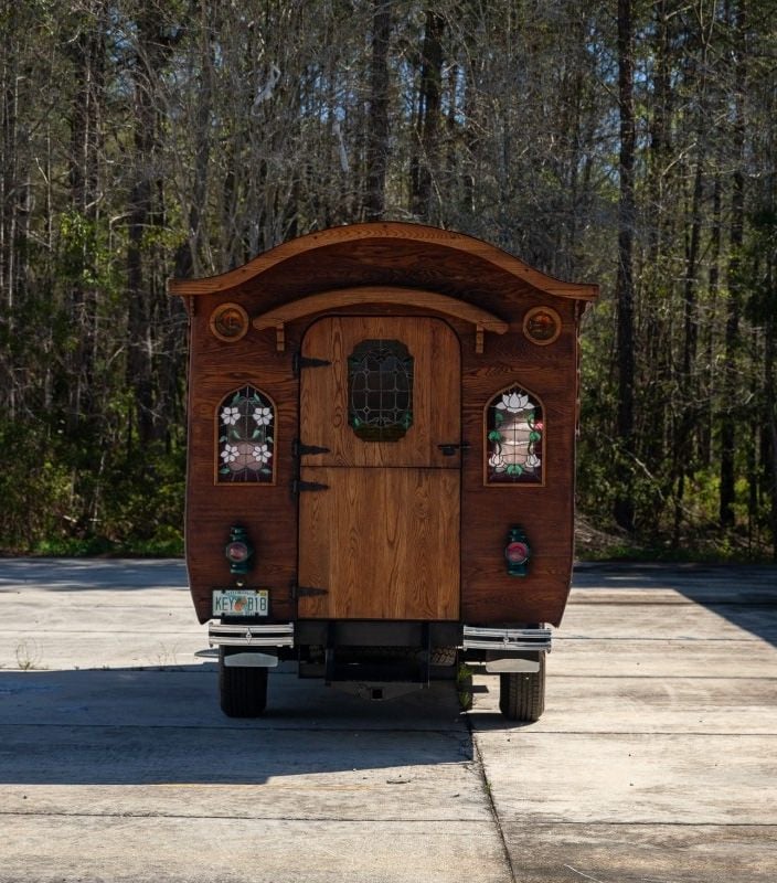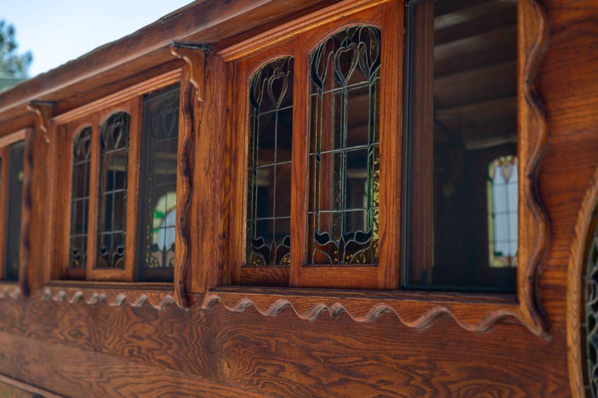 A new rear camper section has been built running from the cab right to the end of the vehicle, it’s mostly made from wood with a copper-looking curved roof, decorative trim down the sides, ample stained glass windows, and rear two-piece barn doors.