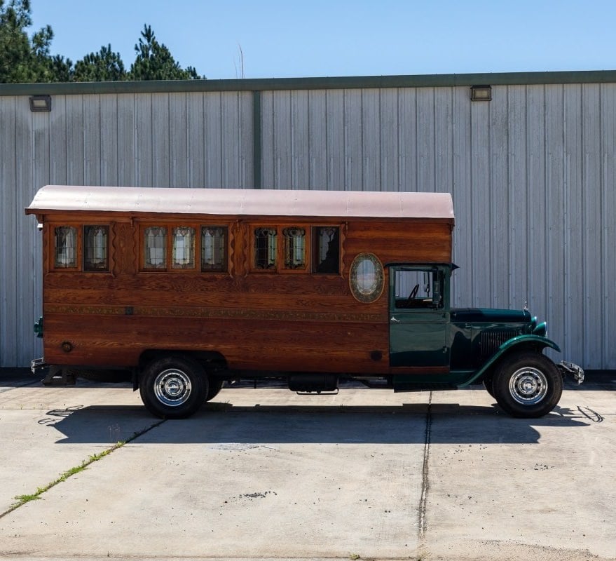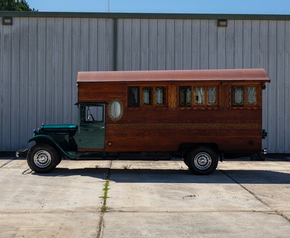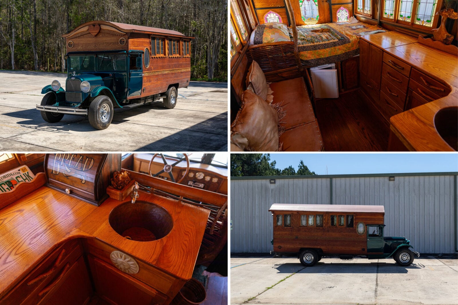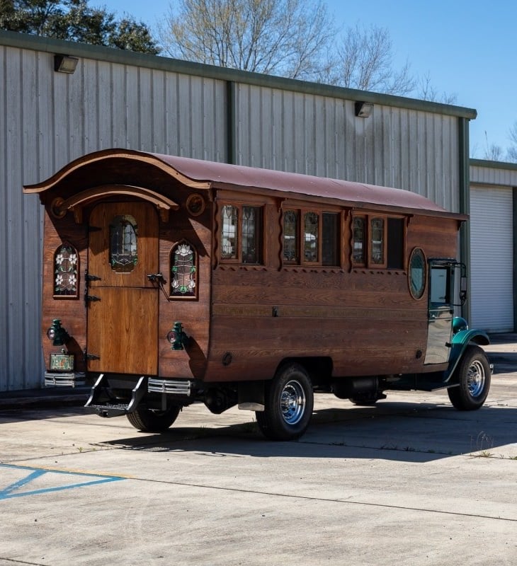 This is a 1928 Chevrolet One Ton truck that’s been converted into a “gypsy-style” camper that includes a double bed, a kitchenette, a seating area, and plenty of stained-glass windows.