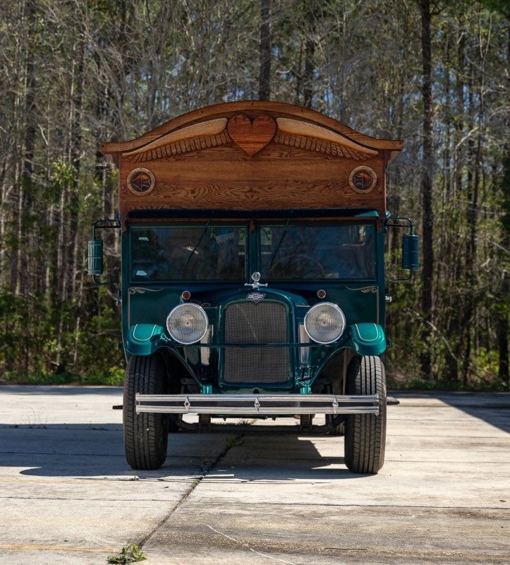 - The vehicle shown here is no longer a standard commercial truck, having been transformed into a highly unusual “gypsy-style” camper. It now uses a much more modern 4.3 liter Chevrolet V6 with a 4-speed automatic, and features a wood-built rear cabin with stained glass, a double bed, kitchenette, seating area, and decorative trim throughout.