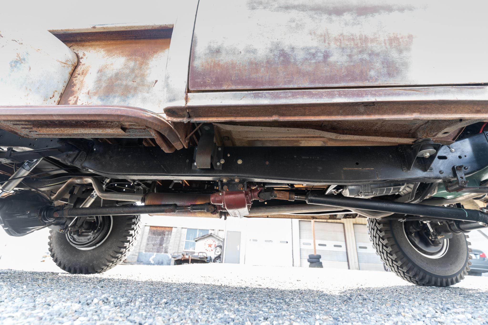 - Power is routed through a T5 5-speed manual transmission and a Rockwell dual-range transfer case, with a 10-bolt front axle and a 14-bolt rear axle completing the driveline. The truck rides on white 16-inch steel wheels shod with 9.00-16 Superlug tires, with lifted suspension, Fox Performance Series 2.0 shocks, and front disc and rear drum brakes.