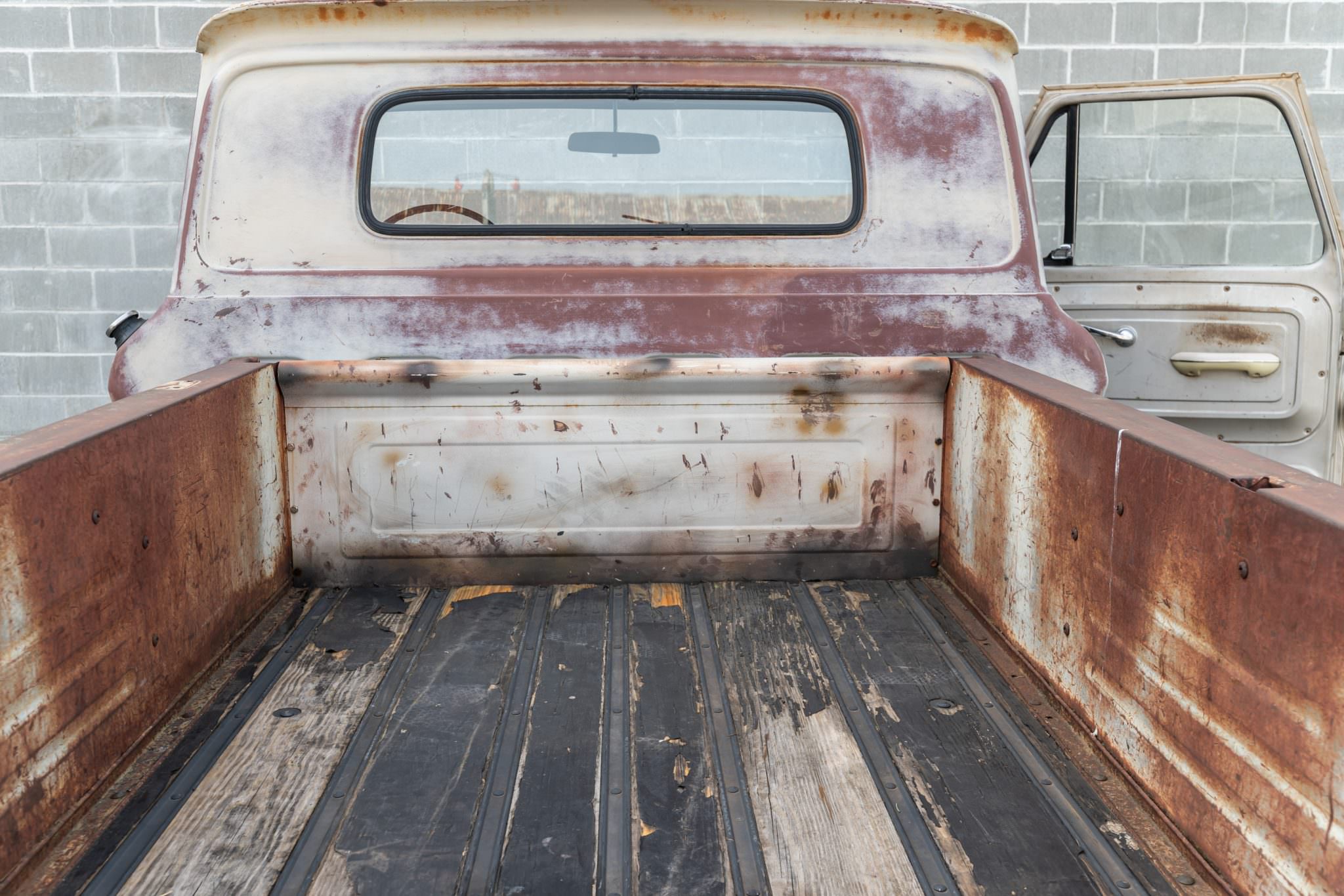 During the refurbishment process, the cab and bed were separated from the frame to allow body repairs to be carried out, and the truck now wears distressed, patina-style paintwork. The Stepside bed has a wood floor, and the truck has a grille guard and a tow ball.