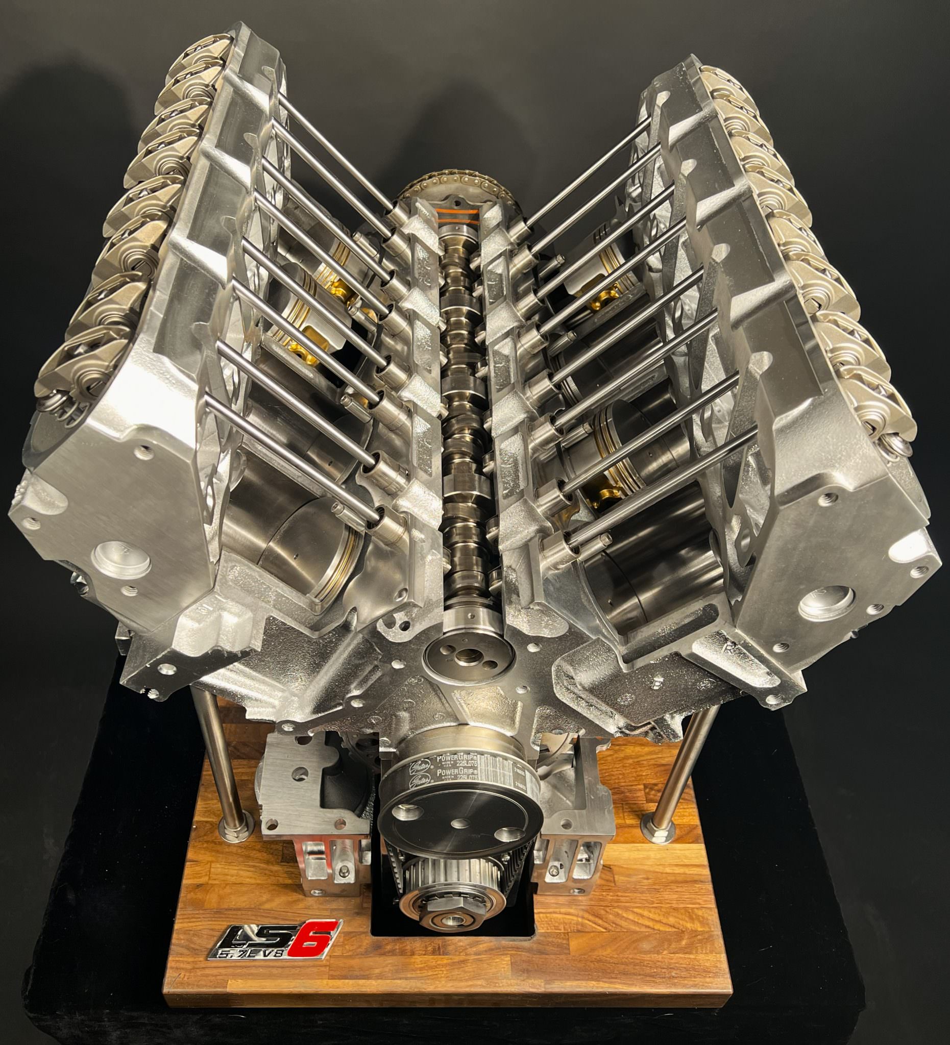 This kinetic sculpture started life as a standard Chevrolet LS6, a V8 engine with a displacement of 5.7 liters that was capable of up to 405 bhp in stock tune, with 400 lb ft of torque. The LS6 was used in the Corvette C5 Z06 production car as well as the Cadillac CTS-V.