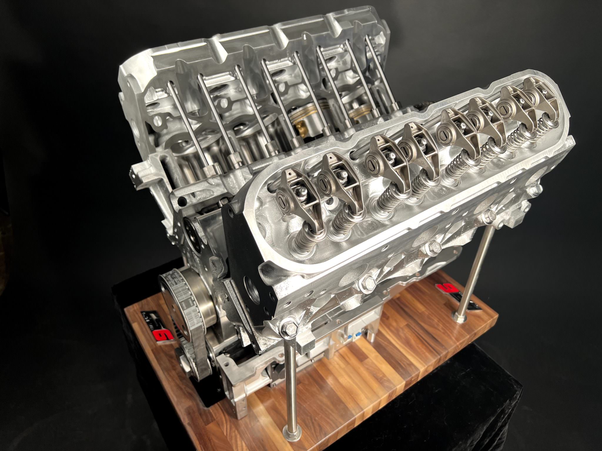 This is a Chevrolet LS6 V8 that has been disassembled, with some parts cutaway to allow many of the internal moving parts to be seen, including the pistons, connecting rods, crankshaft, pushrods, rocker arms, and valves.