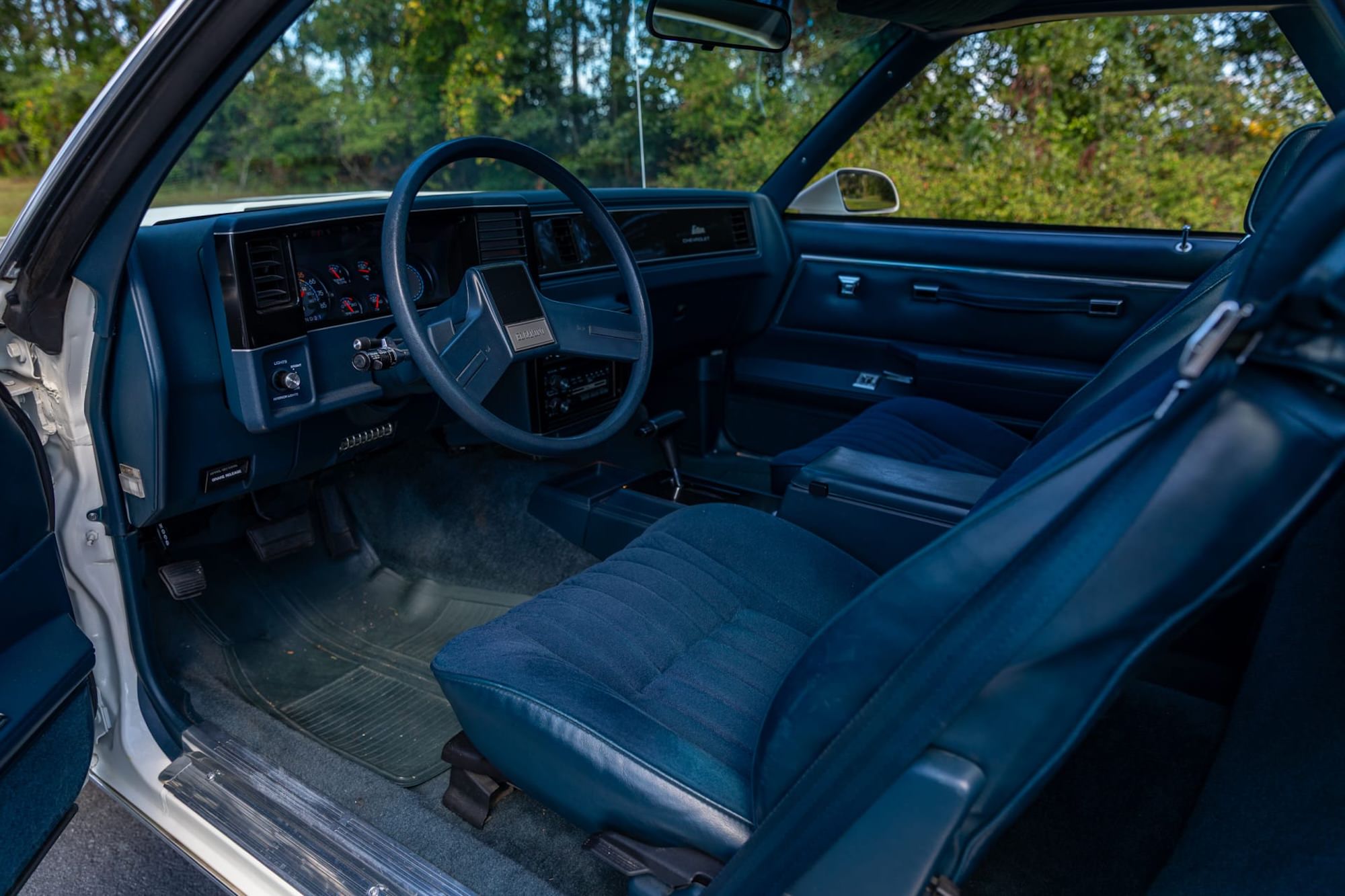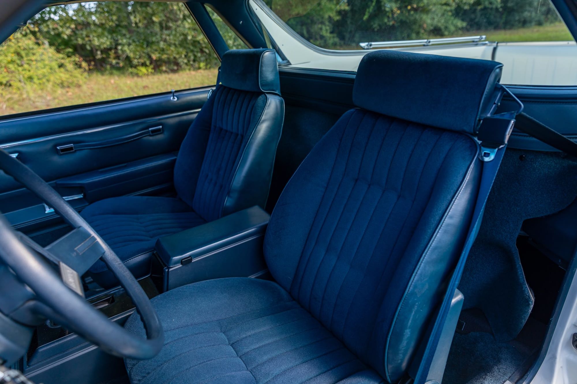It’s finished in white with black graphics, and it rides on correct alloy wheels shod with BF Goodrich Radial T/A tires on all four corners. It has a blue interior, with blue seats, carpeting, door trims, headliner, dashboard, and steering wheel – and the rear cargo tray appears to be in as-new condition.