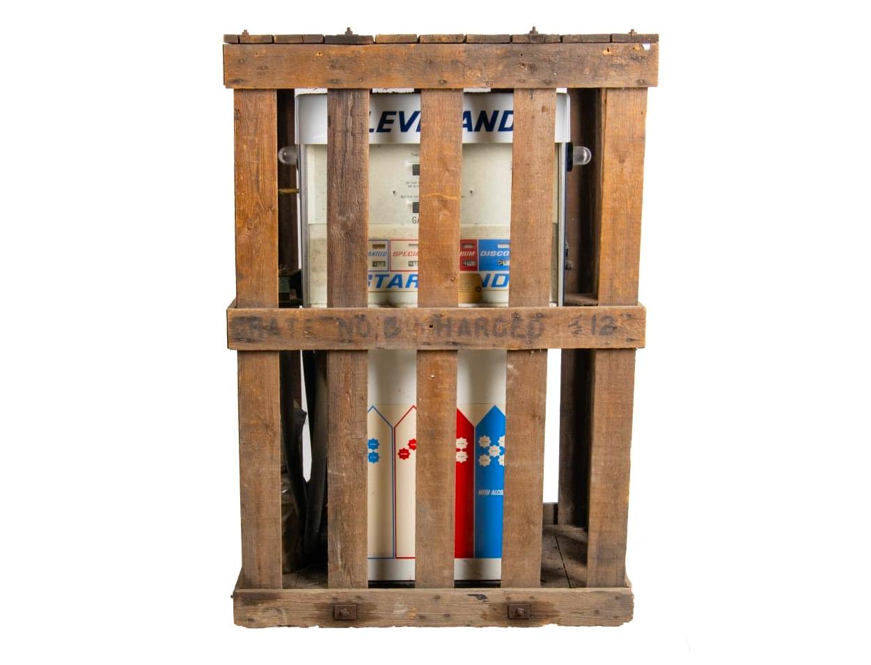 This is a Cleveland Gilbarco gas pump from the 1960s that has remained in its factory delivery crate since new, having never been unpackaged or put into use. It’s likely now unique in the world, and its preservation for 70+ years will make it hugely collectible.