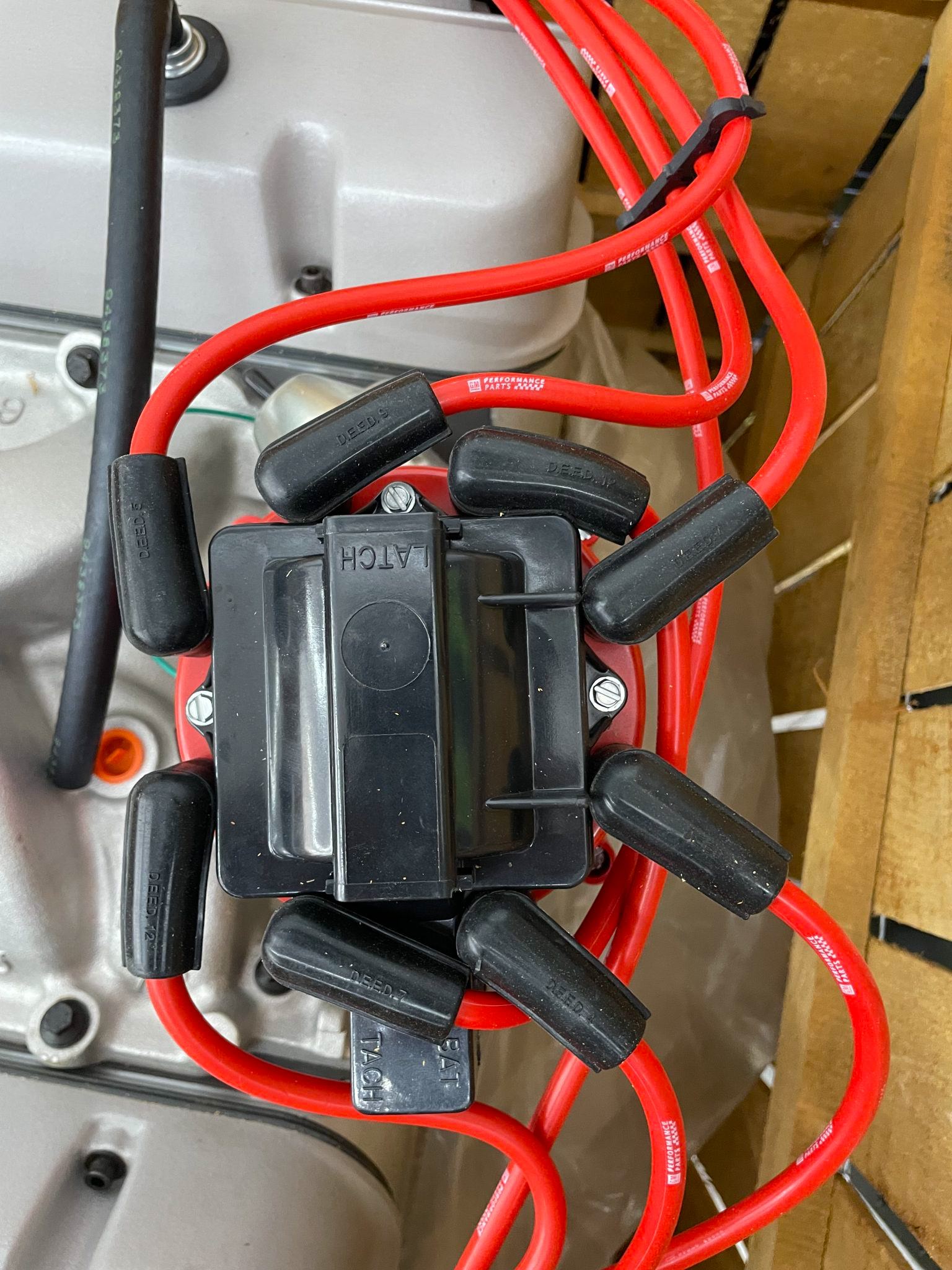As noted higher up, this V8 has a forged steel crankshaft, forged steel connecting rods, and four-bolt main bearing caps, while the pistons are forged aluminum units delivering a 10:1 compression ratio. The valvetrain runs a hydraulic roller tappet camshaft paired with aluminum roller rocker arms, and the engine is designed to operate on readily available 92 octane pump fuel. A flex plate is fitted, and ignition is handled by an HEI distributor with spark plugs and wires included.