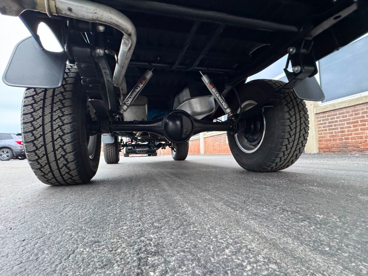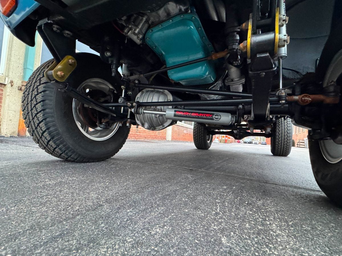 The truck rides on polished aluminum wheels and it’s finished in blue, with a tricolor 1970s-style retro graphics down the side highlighting the new 4×4 drivetrain. It now has a Dana 30 front axle, Warn front locking hubs, a Rough Country steering stabilizer, and Skyjacker shock absorbers.