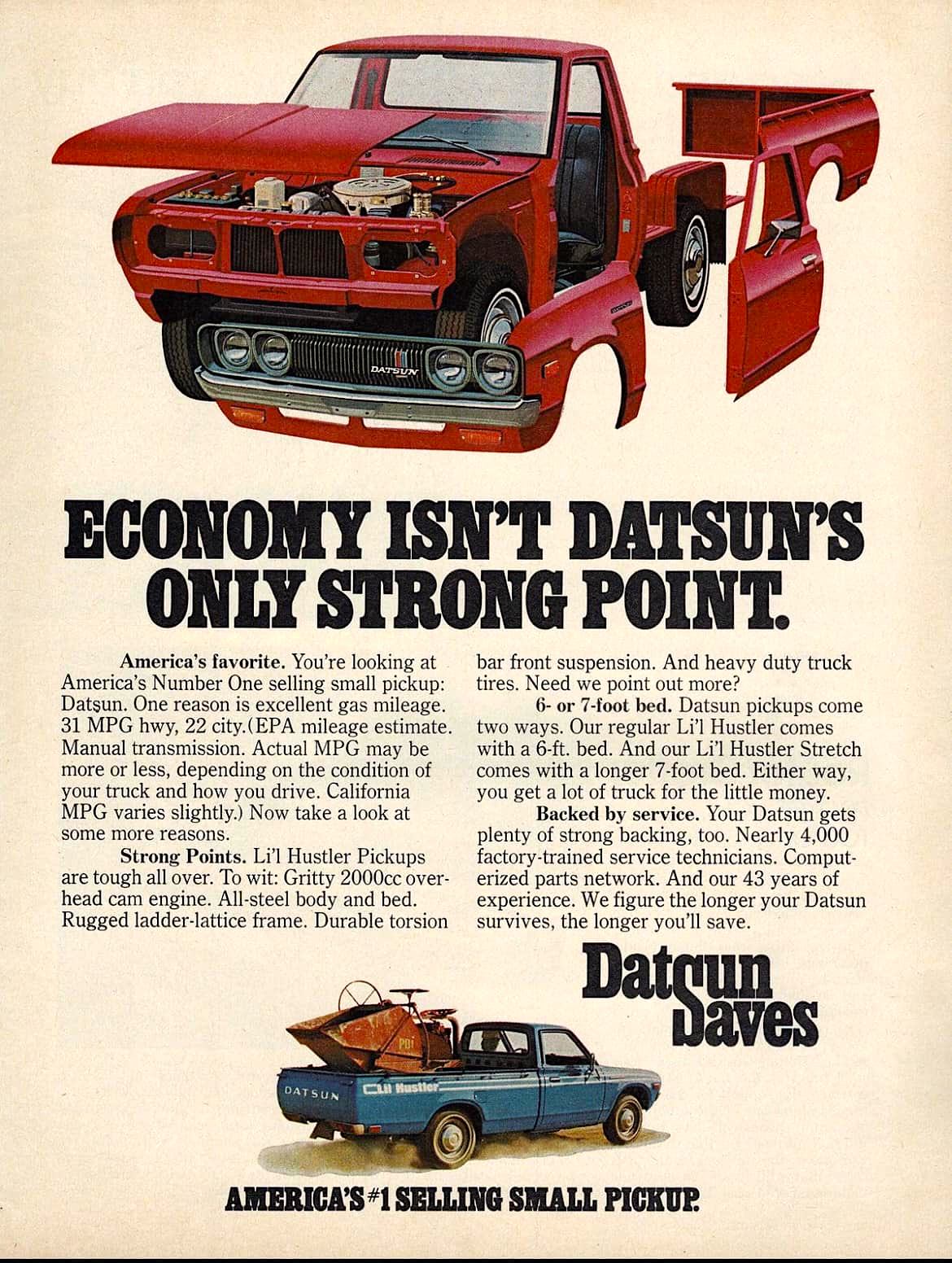 The Datsun 620, along with the Toyota Hilux and Chevrolet LUV, was among the most important Japanese exports to the USA in the 1970s. These trucks helped establish the now wildly popular compact pickup truck market segment, and they offered a lower sticker price than their larger American competitors.