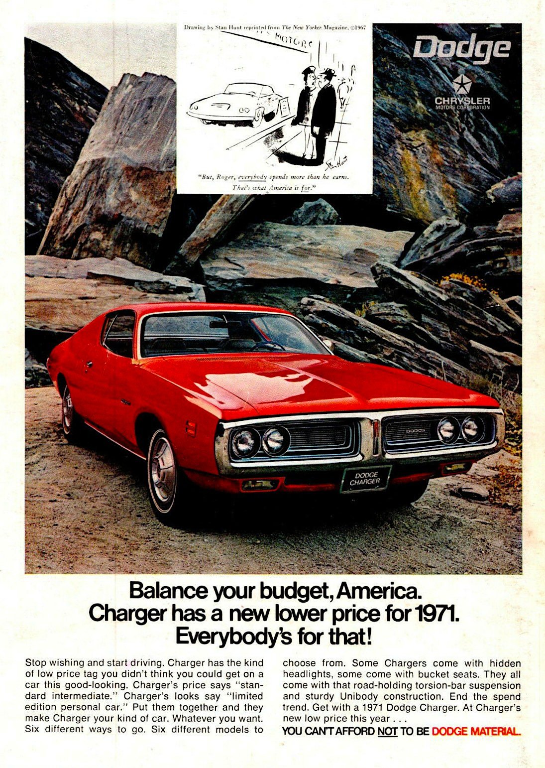 - The 1971 version of the Dodge Charger R/T marked a major redesign on Chrysler’s B-body platform, separating it from the Coronet and giving it a smoother, aircraft fuselage-inspired look. The R/T remained Dodge’s top performance model, built around the big-block V8 lineup just as federal regulations began curbing the muscle-car era.