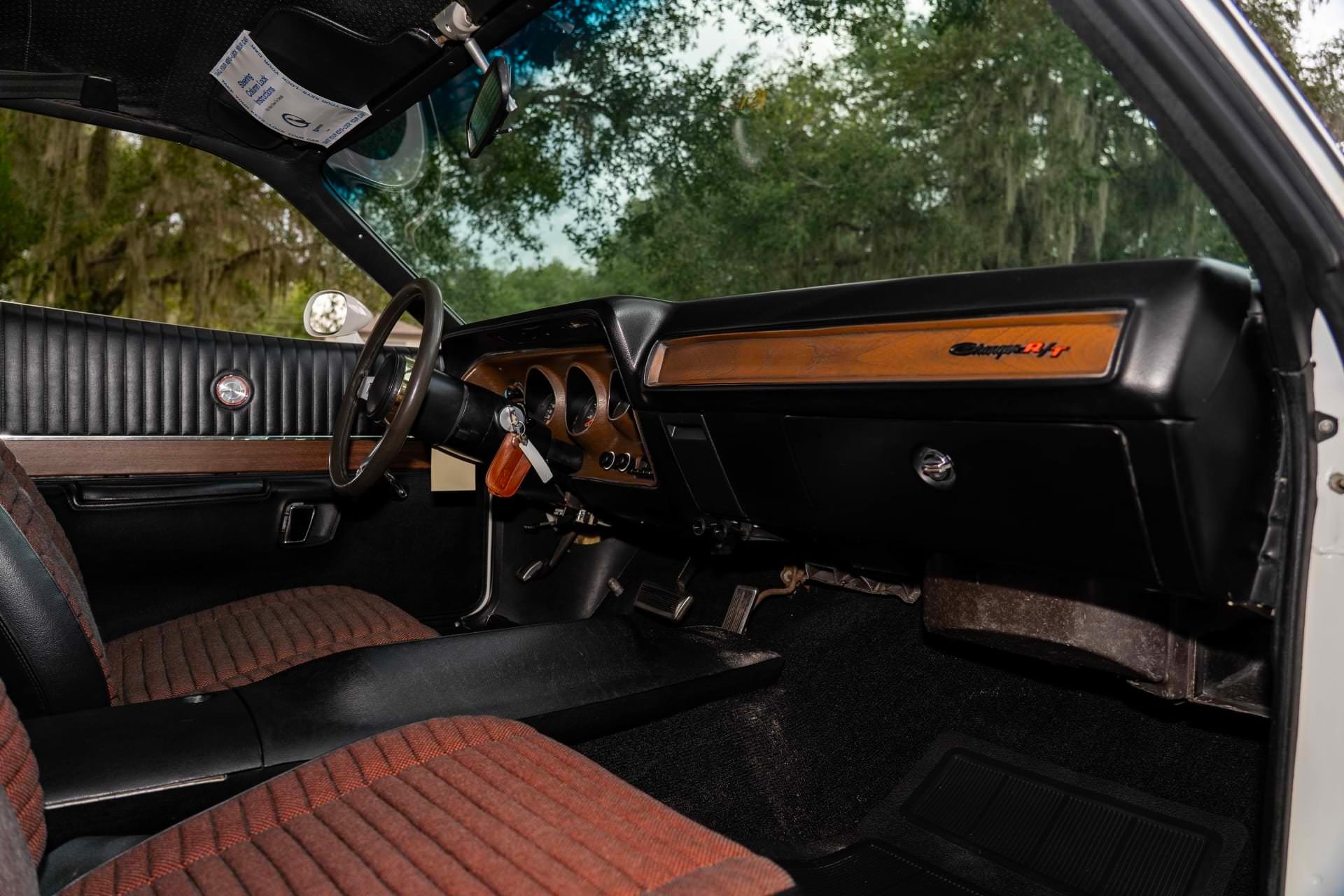 It still has its original matching numbers 440/385 bhp Six Pack V8, 727 automatic transmission, and original sheet metal refinished in original color of Bright White. It came new with power front disc brakes, a Ramcharger hood, a 3.23 Sure Grip rear differential, a houndstooth bucket seat interior, concealed hideaway headlights, as well as front and rear spoilers.