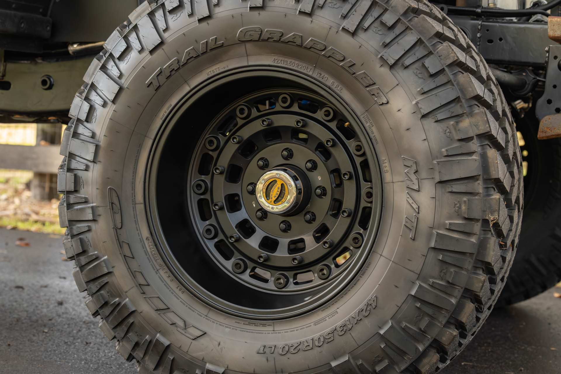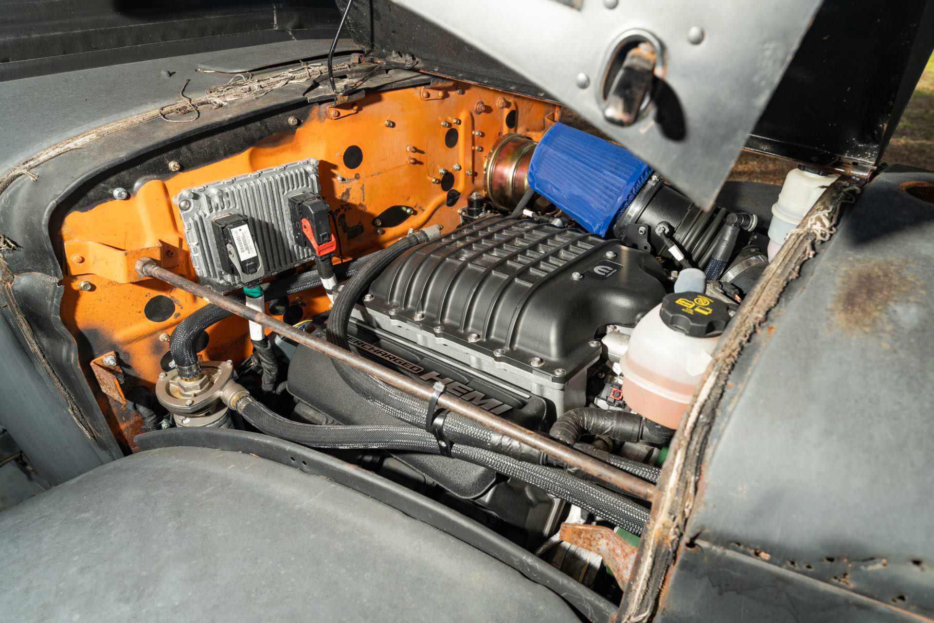 It was then fitted with a supercharged Hellephant 426 cubic inch V8 crate engine rated at 1,000 bhp, with power sent back through an automatic transmission and a dual-range transfer case. Thanks to the Jeep underpinnings it has a tilt steering column, locking front hubs, a rear sway bar and Panhard rod, and modern front and rear live axles.