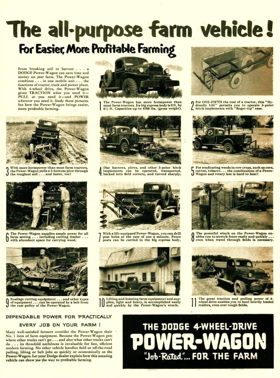 - Early Power Wagons were one-ton trucks with a 126-inch wheelbase, modest power output, and minimal comfort. Their narrow beds, PTO options, winches, and ultra-low gearing prioritized off-road traction and industrial usefulness over speed or refinement, placing them closer in spirit to vehicles like the Land Rover and Unimog than civilian pickups.