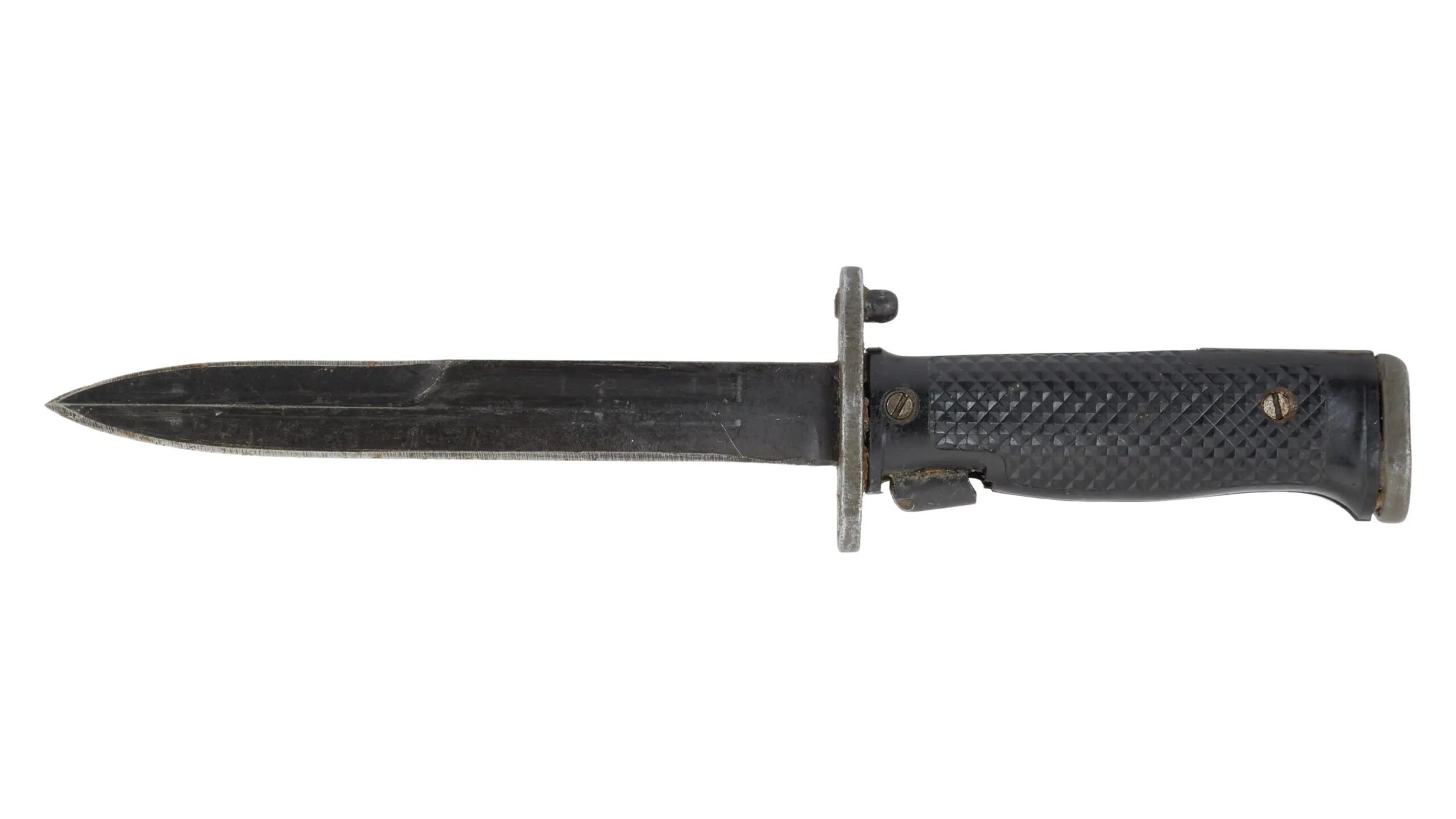 It came paired with the M8 or M8A1 fiberglass scabbard, a pattern later standardized across multiple U.S. bayonets. The M4’s lineage continued long after WWII, influencing later American bayonets including those for the M16 rifle.