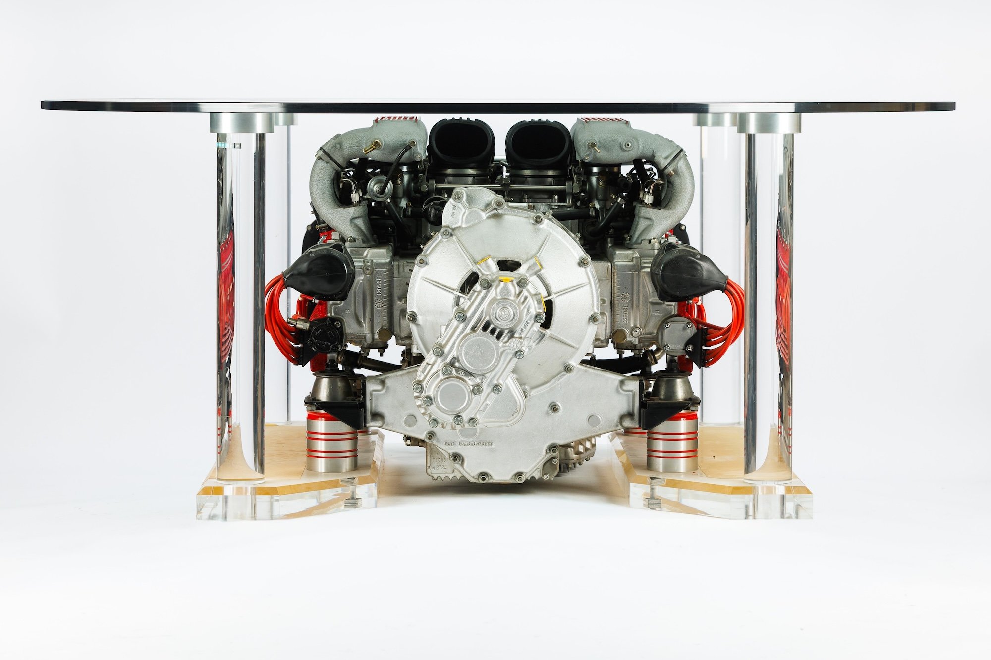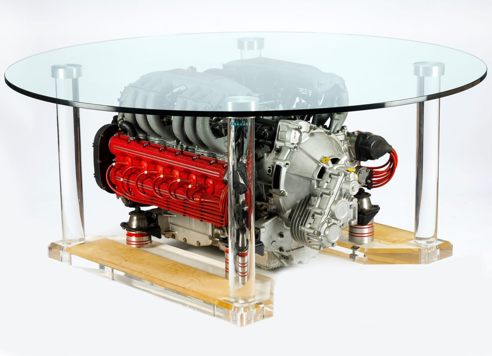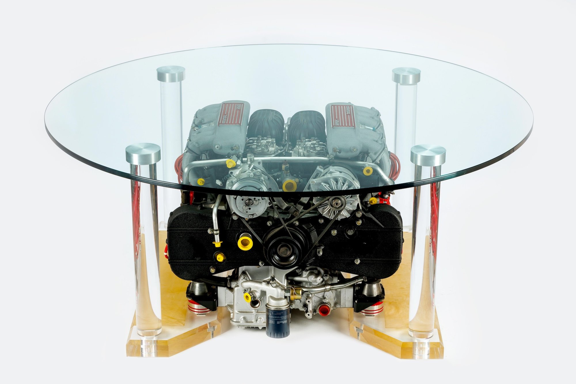 This is a glass-topped coffee table built around an original Ferrari Testarossa Flat-12 engine. Unlike with many engine-based coffee tables, the engine in this case hasn’t been modified for table duties, and looks just about ready to be dropped into a Testarossa and put back to work.