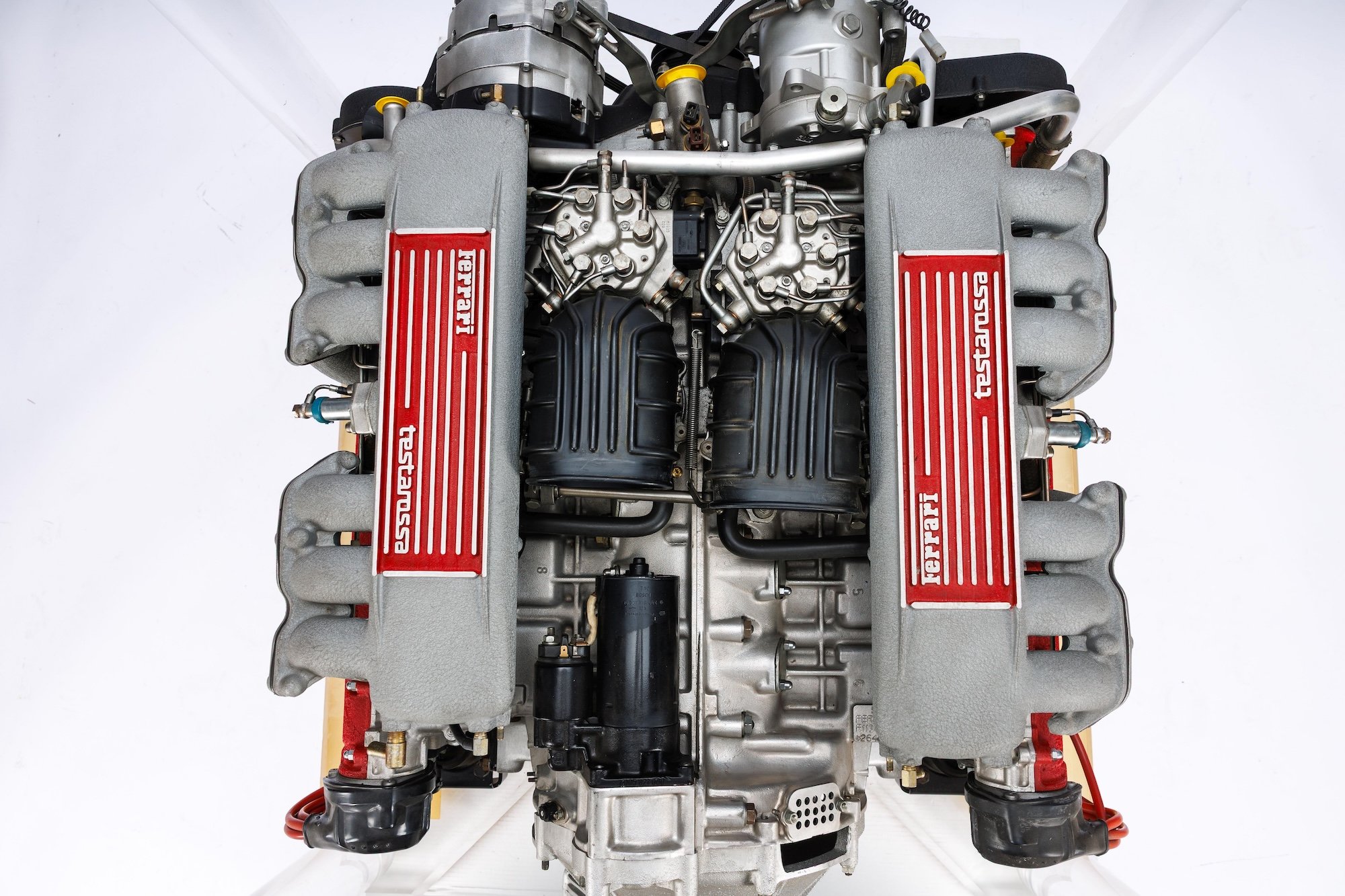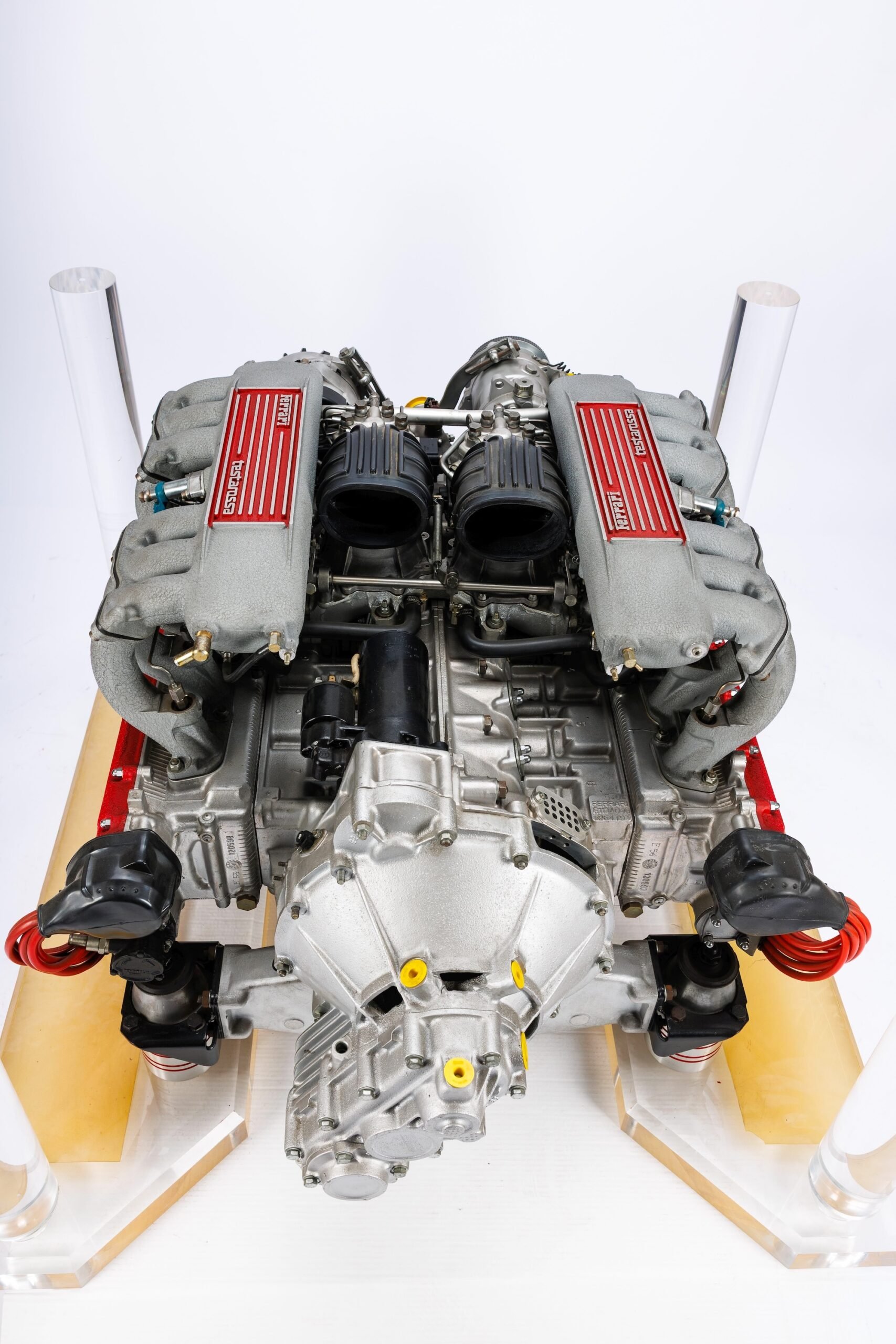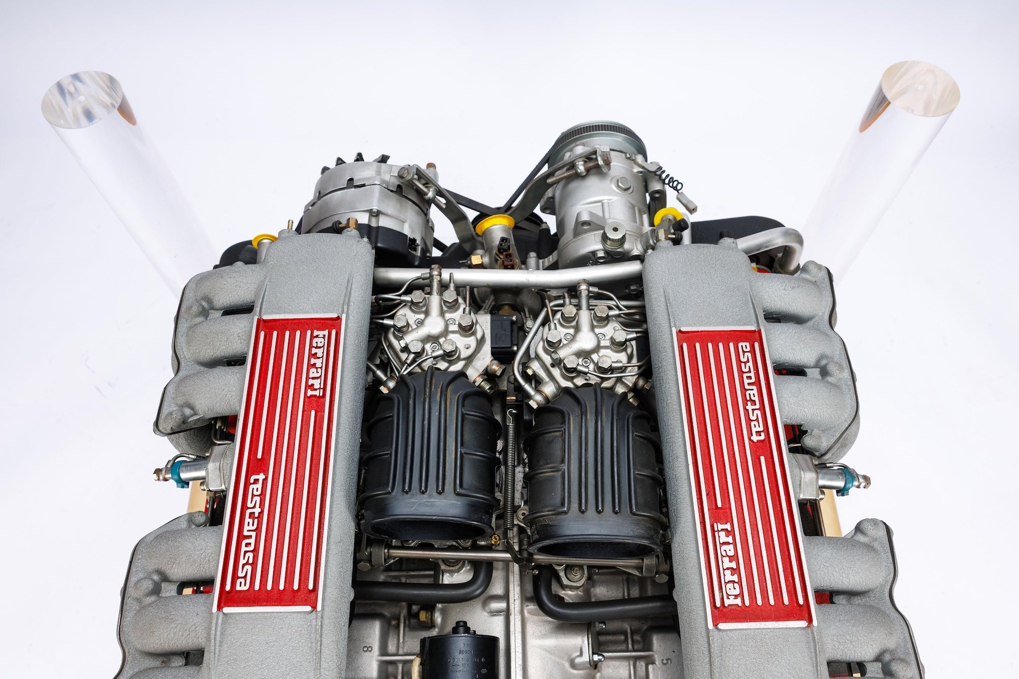 This coffee table consists of a glass top mounted to perspex legs. The Testarossa Flat-12 is sitting on small stainless legs fitted to its original engine mounts, and it comes with many of its ancillaries still fitted.