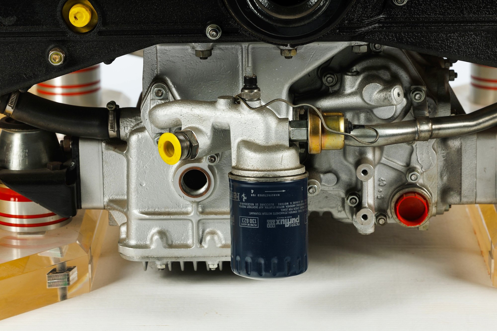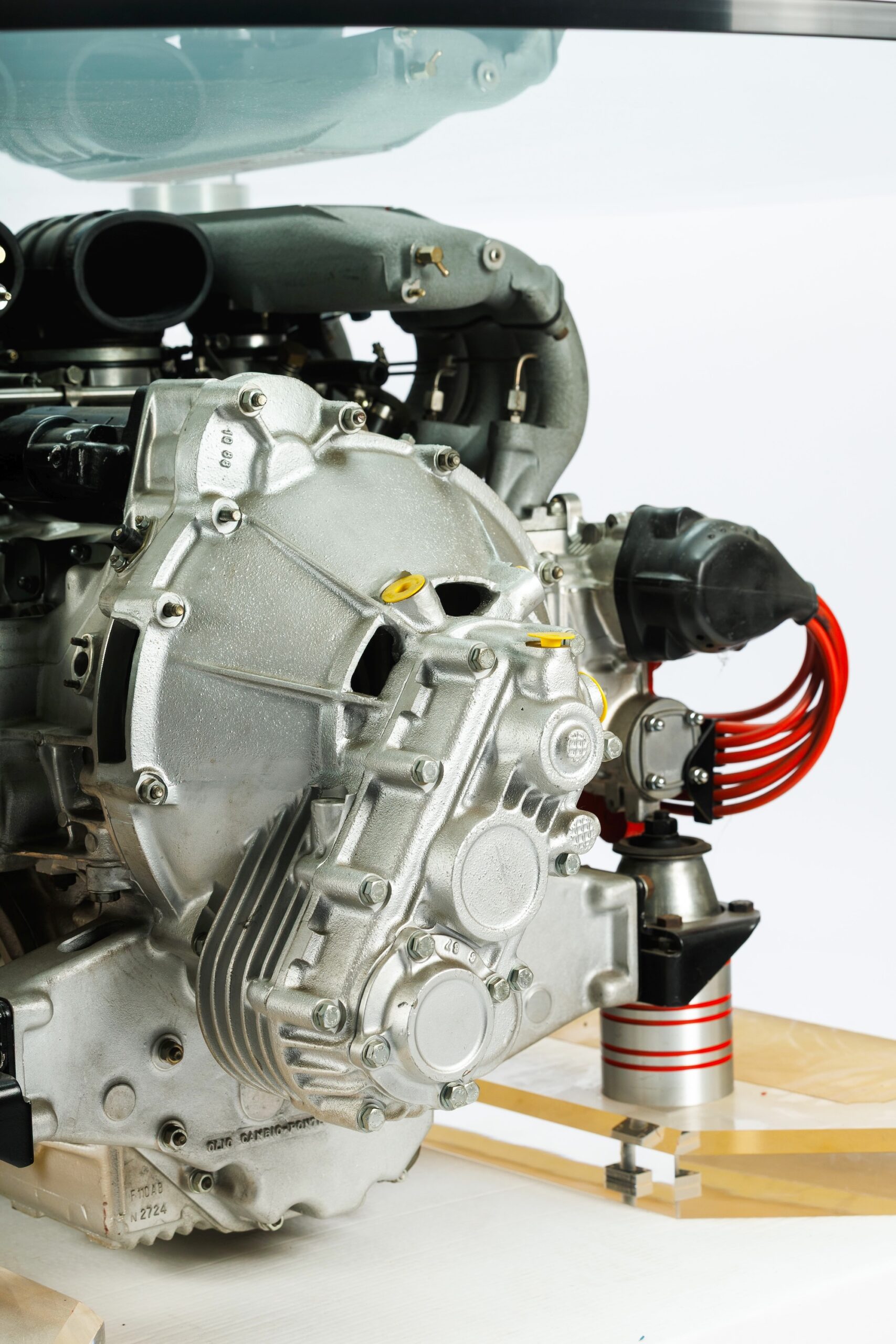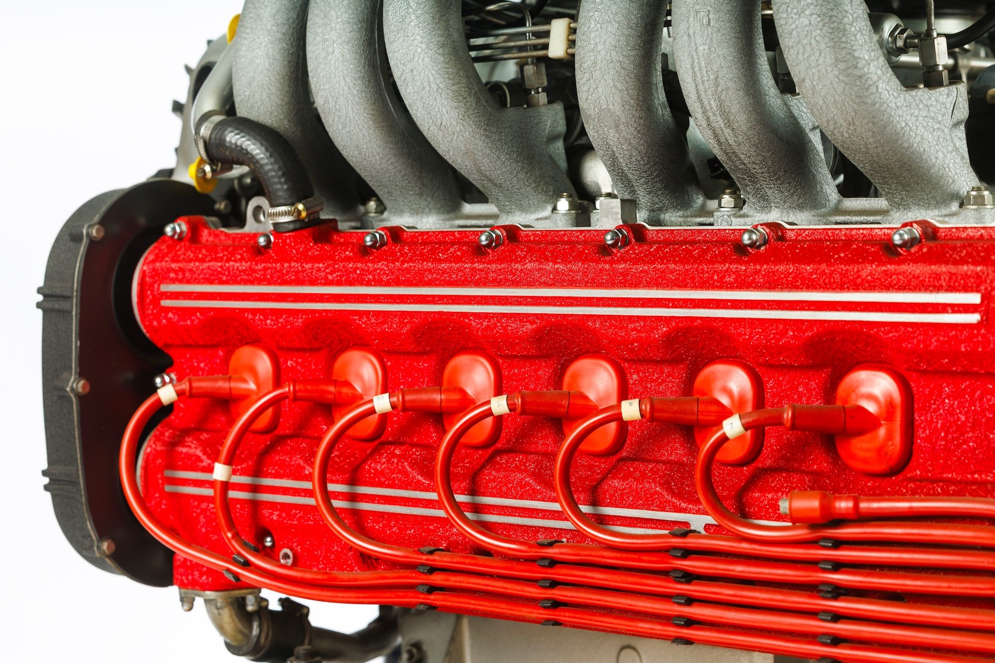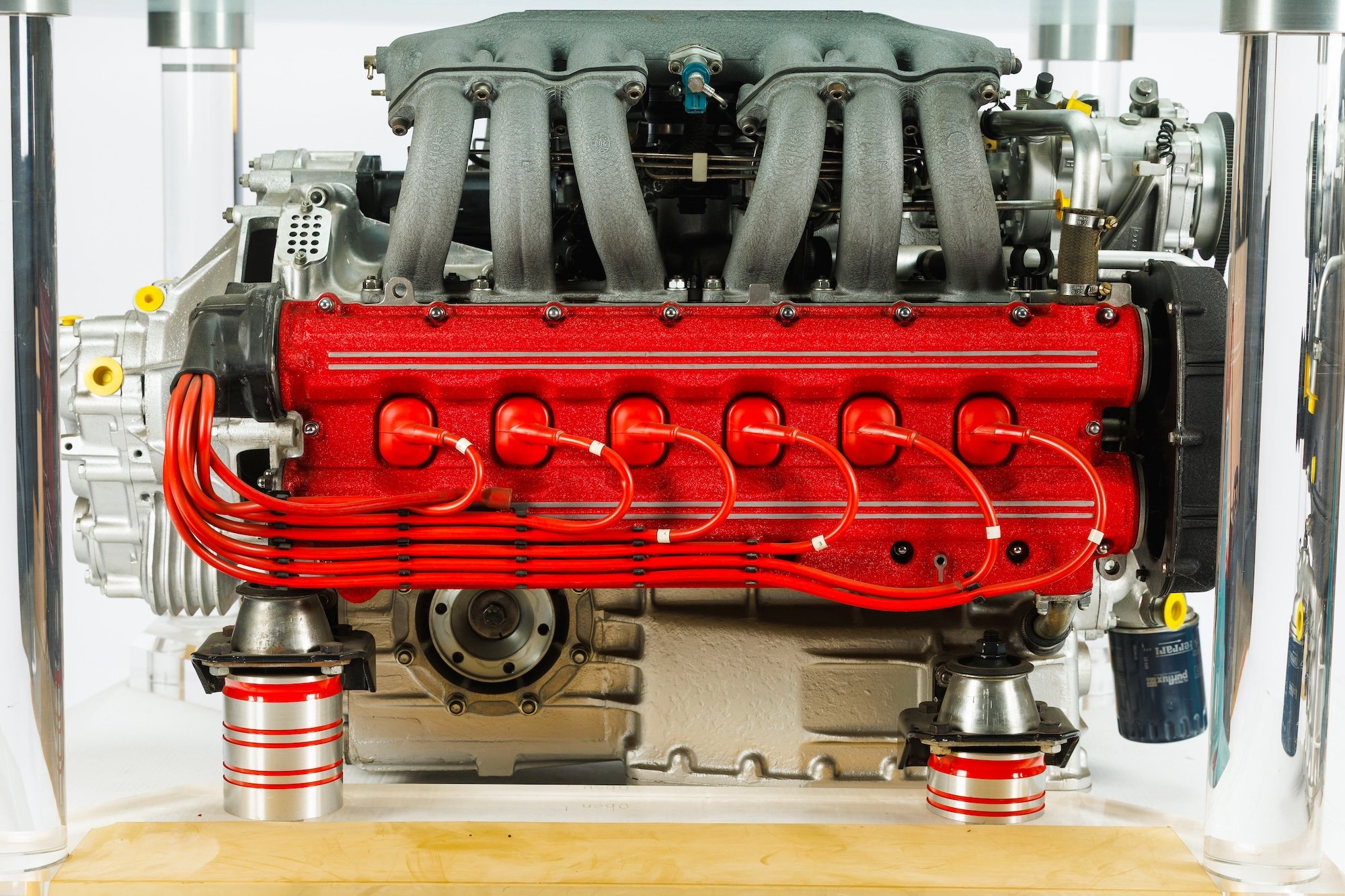 This coffee table consists of a glass top mounted to perspex legs. The Testarossa Flat-12 is sitting on small stainless legs fitted to its original engine mounts, and it comes with many of its ancillaries still fitted.
