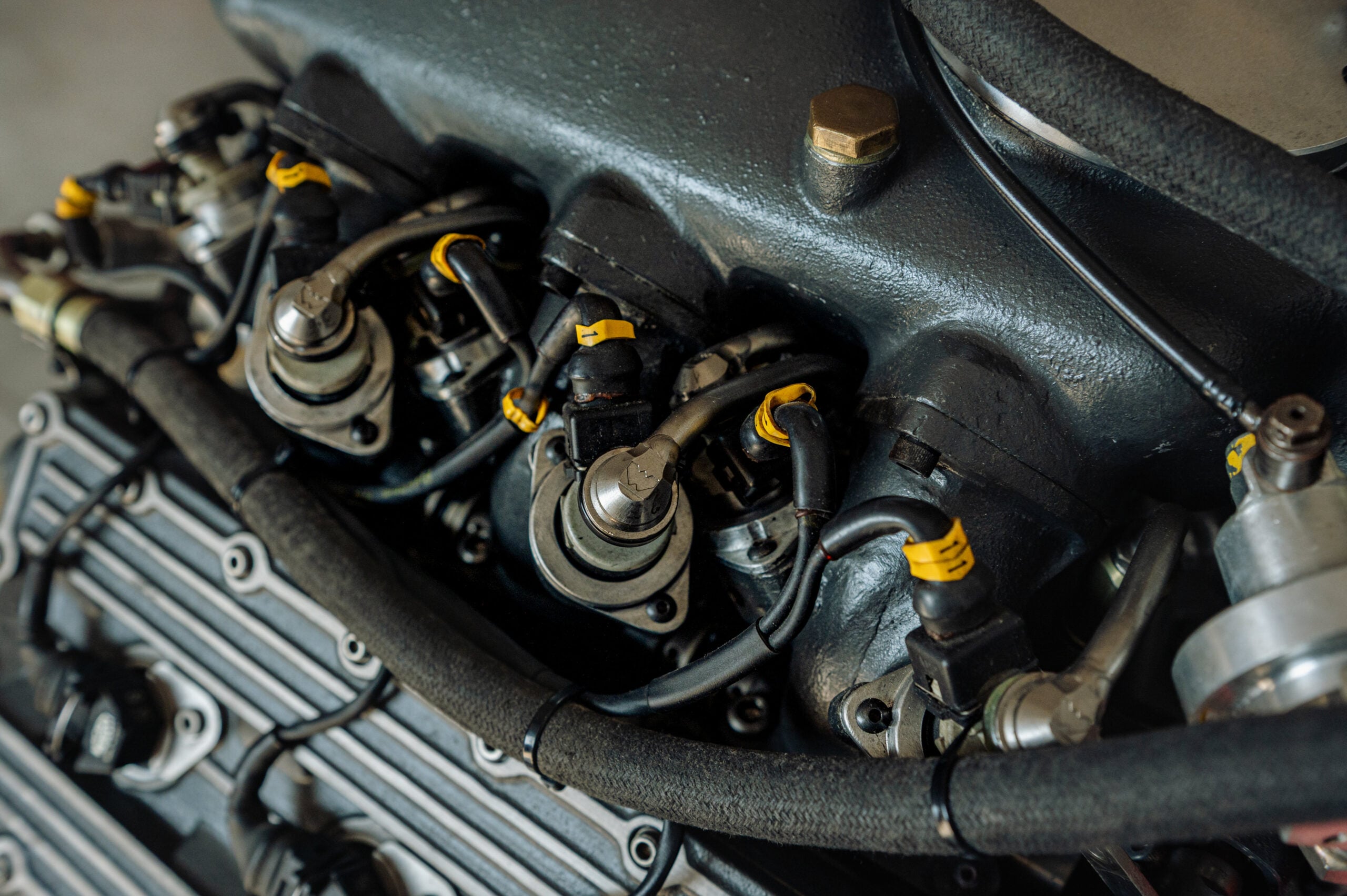 Compression was relatively low at 8:1 to accommodate high boost pressures, with four valves per cylinder actuated by gear-driven twin overhead cams on each bank. Fueling was handled by Weber-Marelli digital electronic injection with twin injectors per cylinder, ignition came from Magneti Marelli static electronic systems, and forced induction was supplied by two side-mounted Garrett turbochargers.