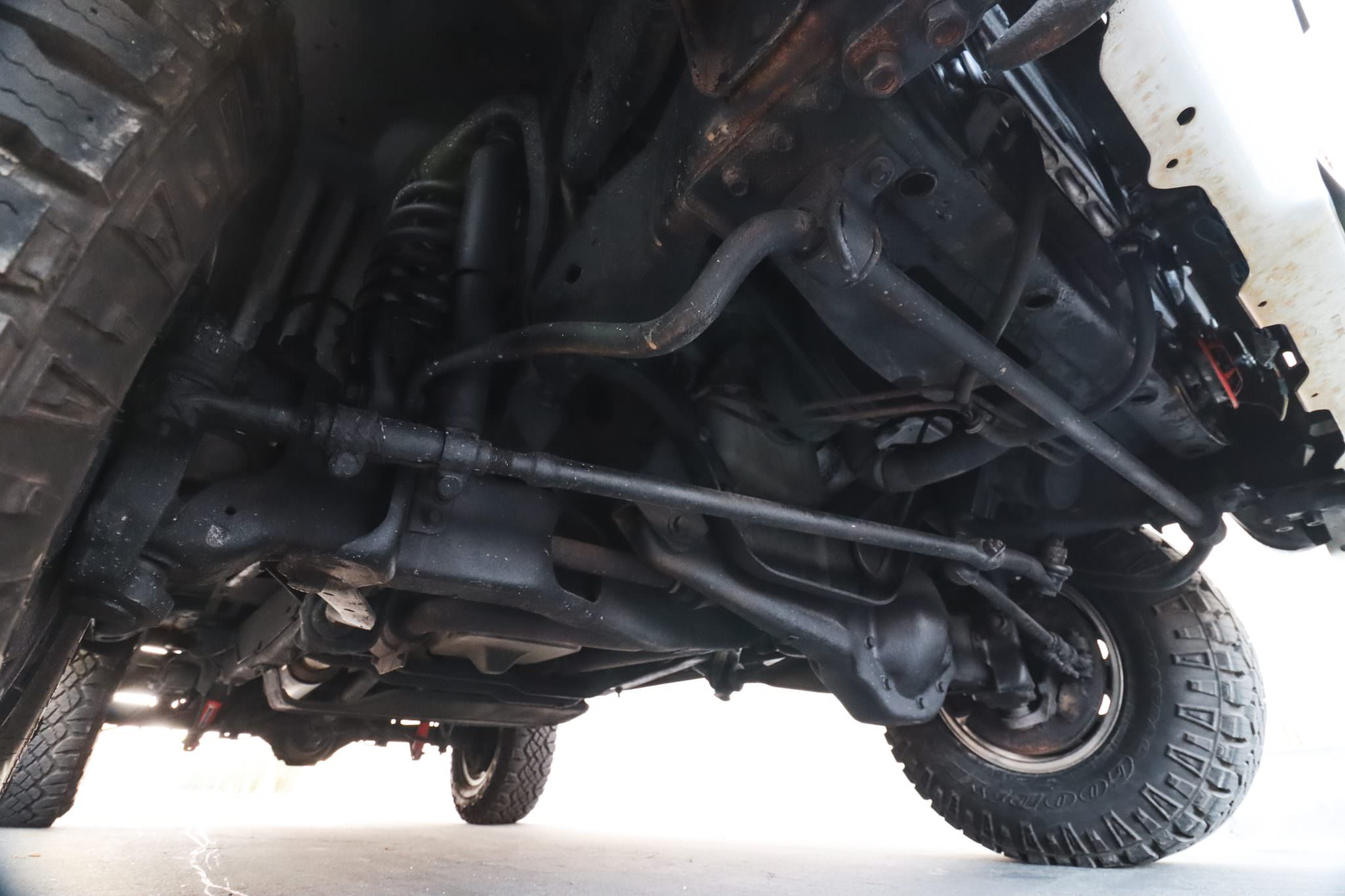 The exterior was repainted in September 2025 and retains the removable, body-color hardtop and drop-down tailgate with power window. Additional exterior details include yellow auxiliary driving lights, window tint, a receiver hitch, and a swing-away spare tire carrier. The ride height remains close to factory, it now sits on 15 inch eight-hole alloy wheels shod with 31×10.50 Goodyear Wrangler DuraTrac tires.