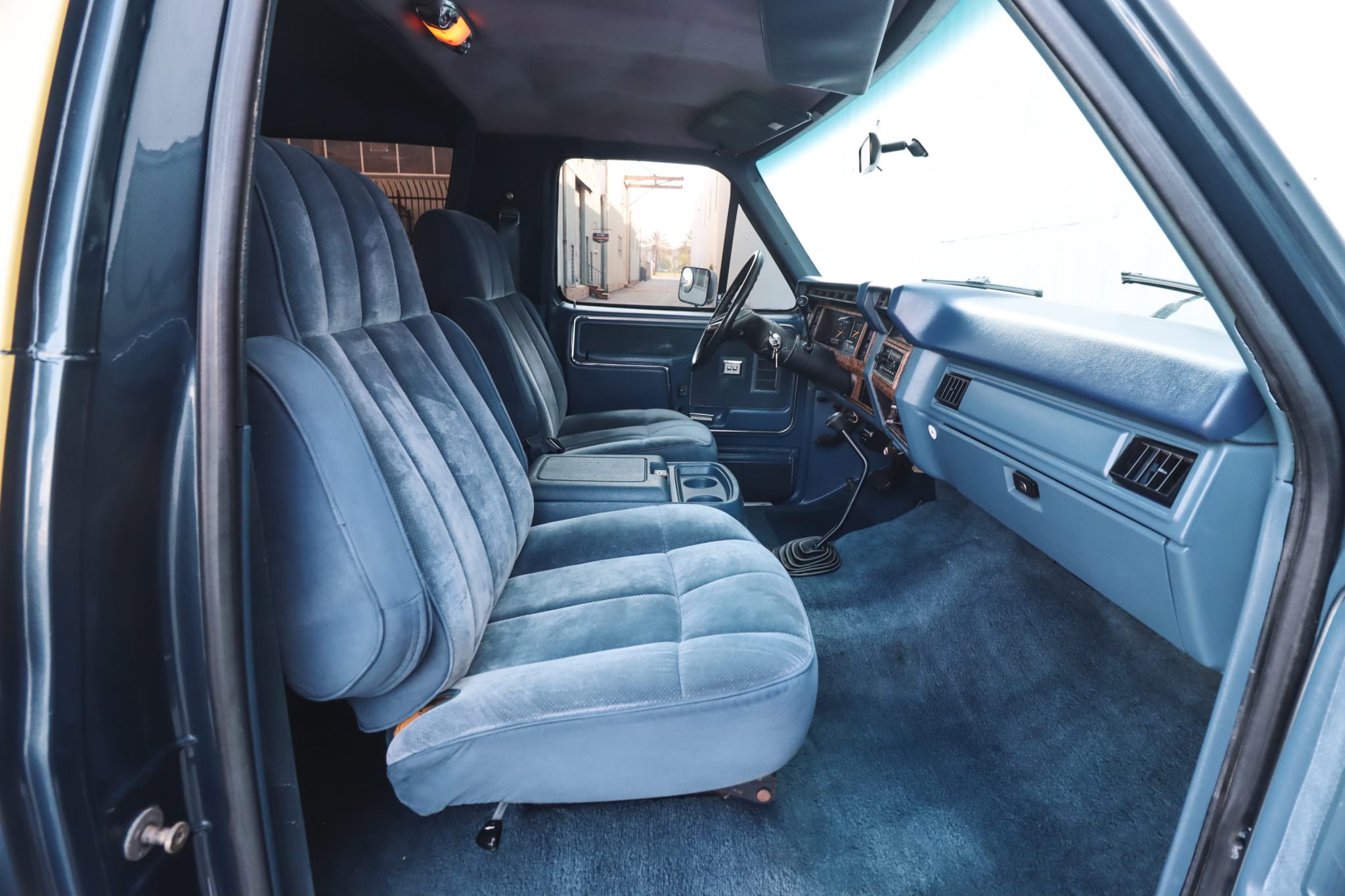 Inside, the cabin has blue cloth captain’s chairs up front with folding armrests and a removable rear bench, complemented by woodgrain dashboard trim. Equipment is on point for the XLT trim level and includes air conditioning, cruise control, power windows, a locking center console, and an AM/FM stereo with digital clock.