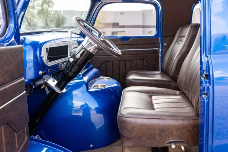 This engine is paired with a TH400 3-speed automatic transmission and a 4.10:1 rear axle. Braking is handled by a hydroboost-assisted system with front discs and rear drums. The body received a ceramic coating to protect it when out on the road, and it rolls on 16-inch American Racing wheels shod with Cooper tires.