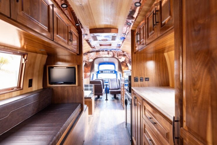 The interior is beautifully appointed, and if it wasn’t for that flatscreen TV you could believe the whole RV had been built in the 1940s by a master craftsman.