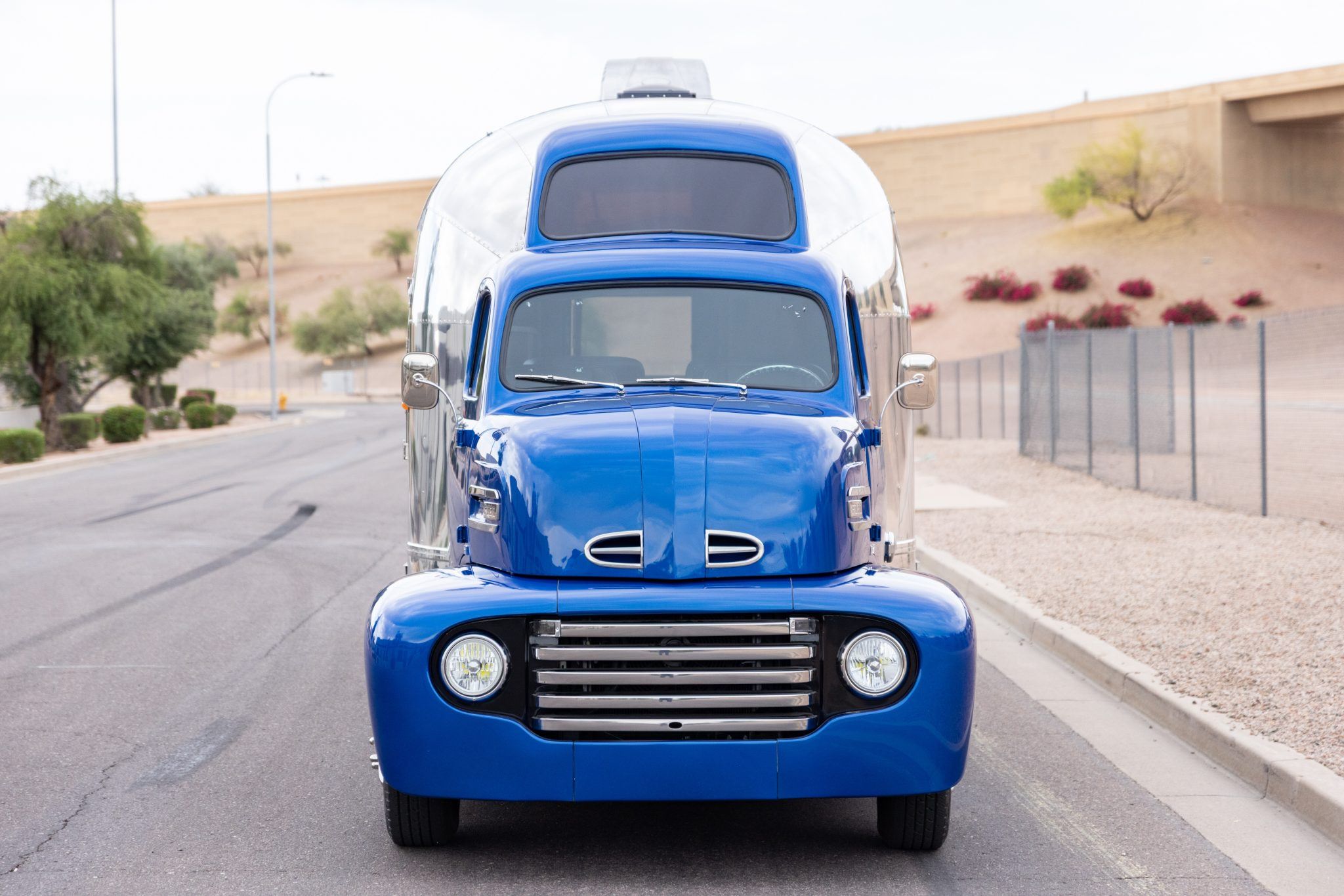 This is a custom 1948 Ford F-5 COE that was transformed over the course of eight years into a unique camper with a full Airstream trailer integrated at the rear.