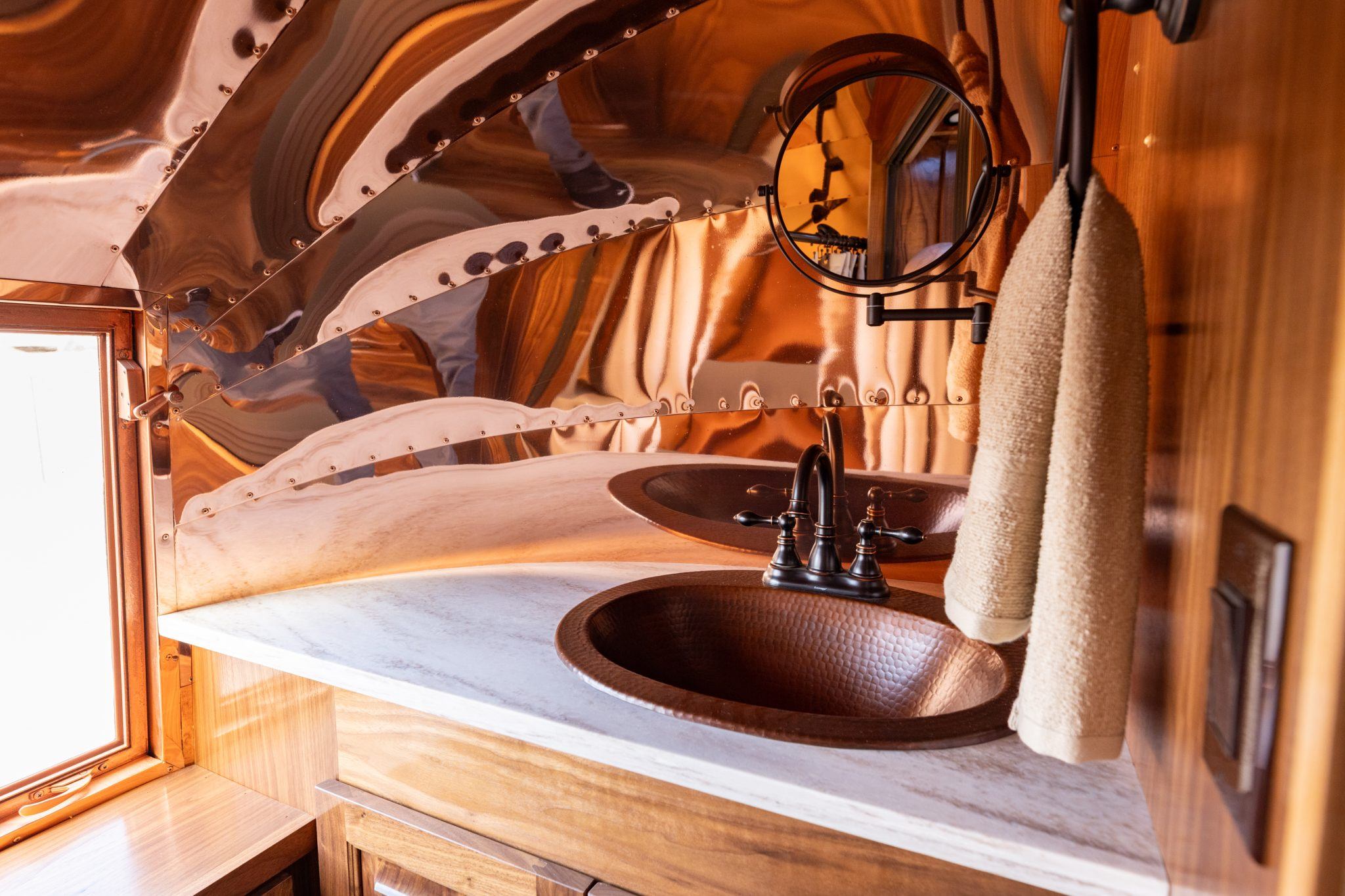 The cab has Tobacco Leaf leather upholstery, digital gauges, a tilt steering column, Vintage Air climate control, and a Pioneer touchscreen system with a backup camera. Inside the camper section, the fit-out includes wood-look vinyl flooring, solid-surface countertops, LED lighting, copper sink fixtures, polished copper sheet at both ends, and a functional bathroom with shower and toilet.