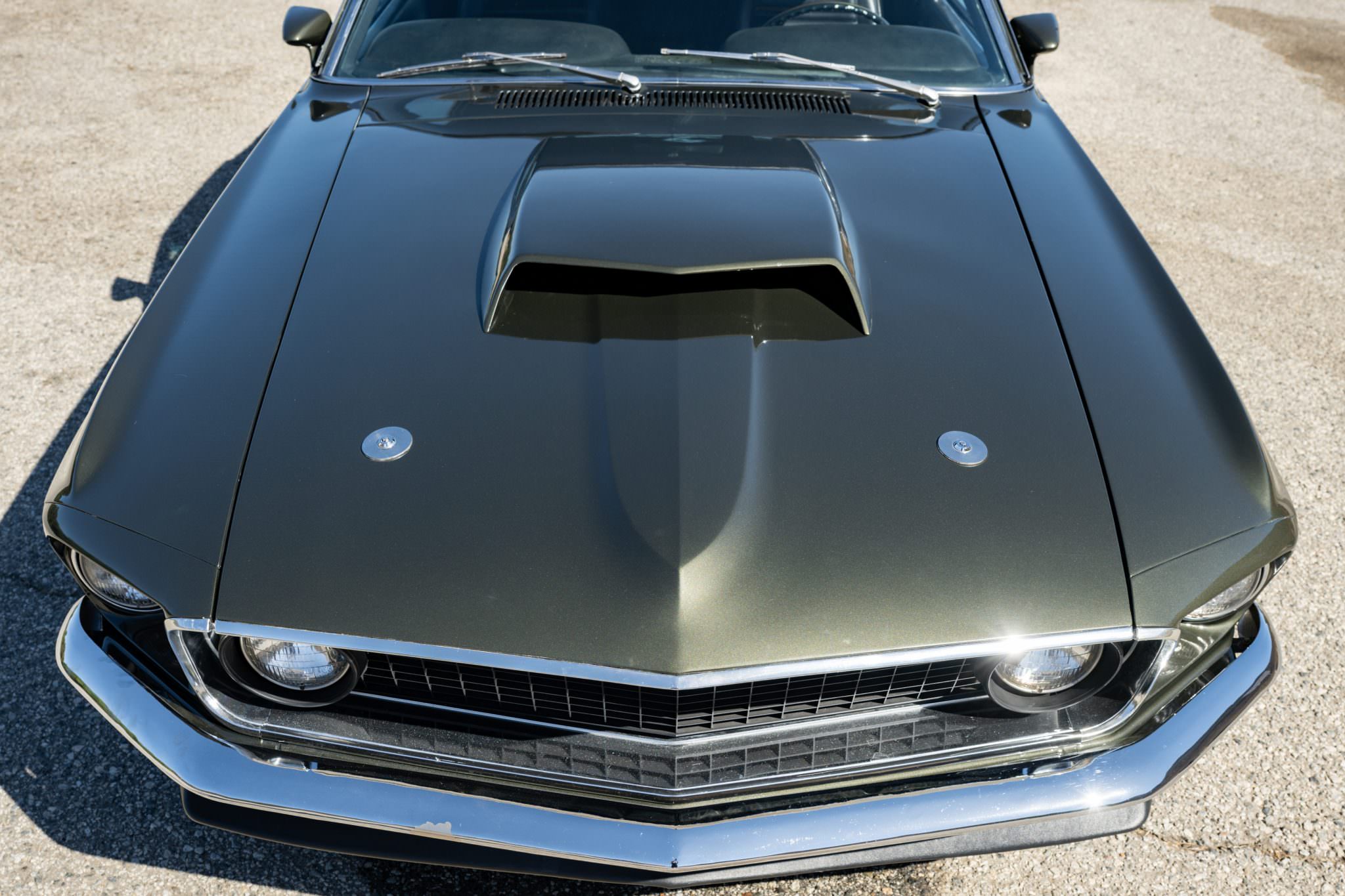 Finished in Black Jade with Boss 429 badging, a functional hood scoop, and rear window louvers, the car keeps its period-correct road presence while now incorporating an array of modern performance upgrades. It rides on 15 inch Magnum 500-style wheels with Cooper tires up front and Mickey Thompson drag radials at the rear. It rides on Calvert Racing springs and braking is managed by factory-style front discs and rear drums.