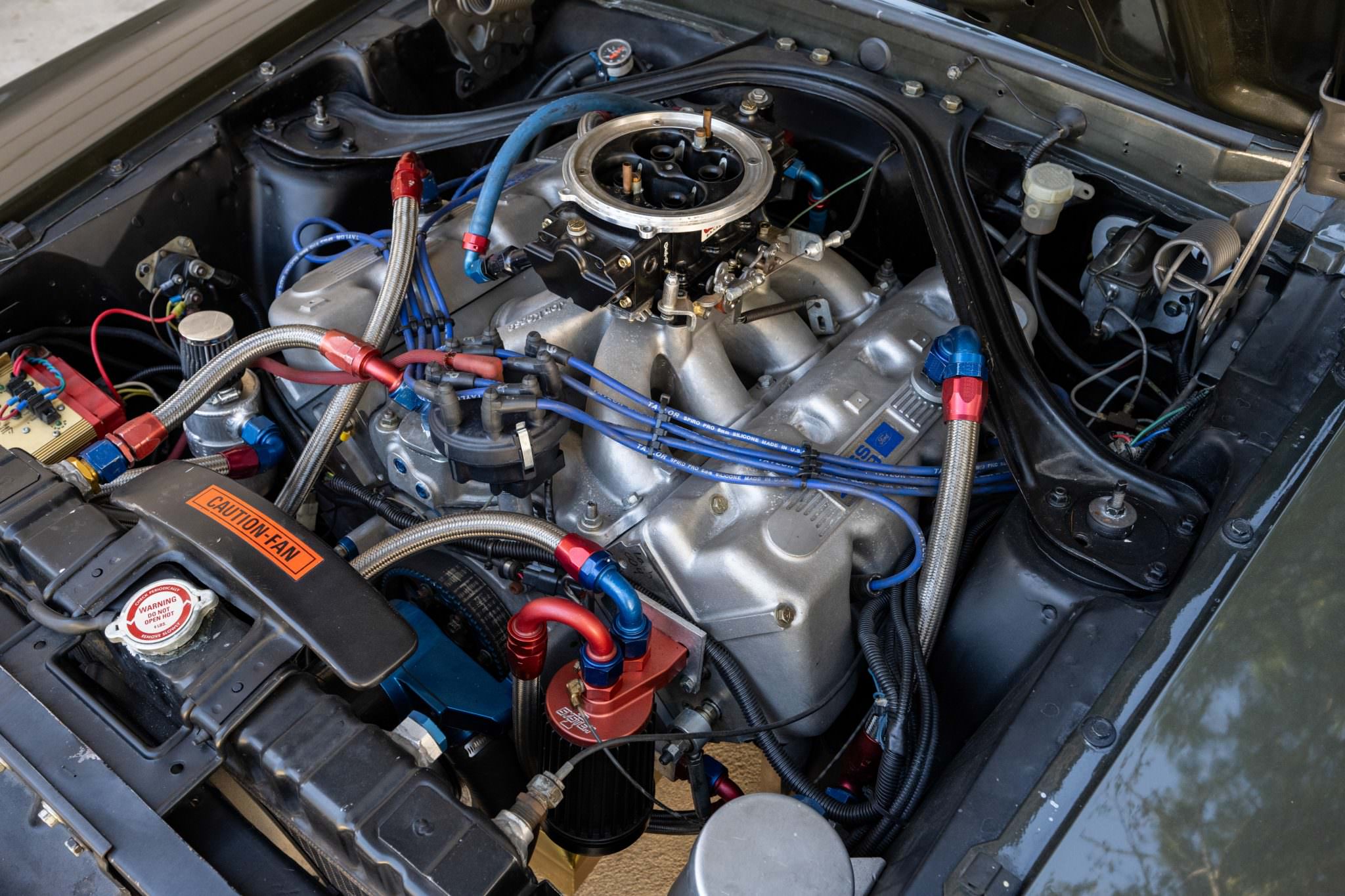 The Kaase-built 598 V8 sits very much at the center of the car’s transformation, it has a Ford Motorsport block, a 15:1 compression ratio, a Get’M Garage 1,650 cfm carburetor, Hedman headers, and an MSD 7AL ignition.