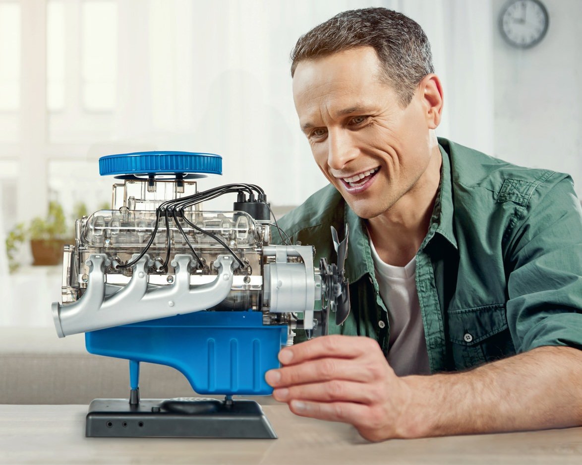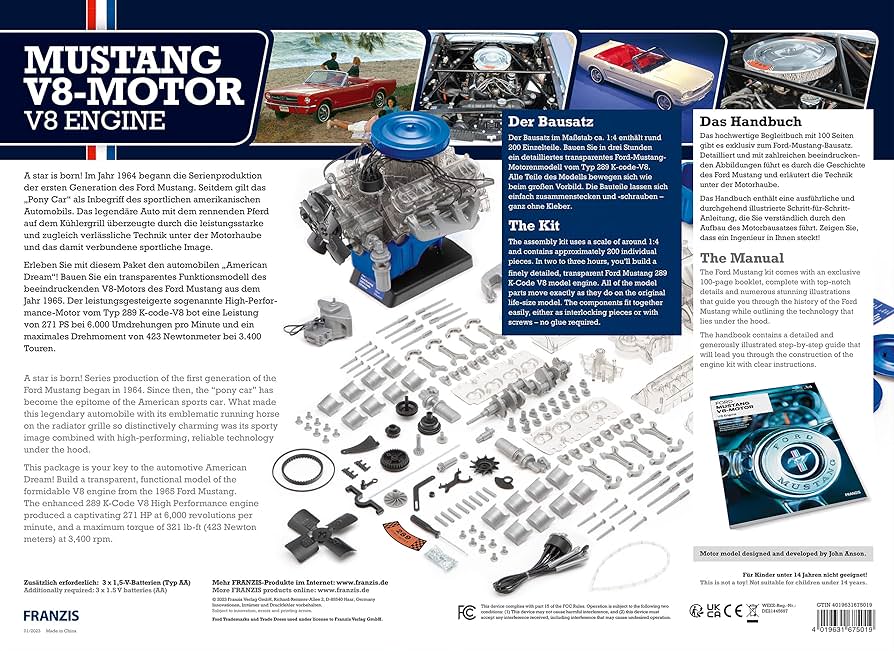 This is a 1965 Ford Mustang K-Code 289 V8 kit – a transparent 1:4 scale model of the iconic V8 consisting of over 200 parts that all either click together or use screws – there is no gluing or painting required.